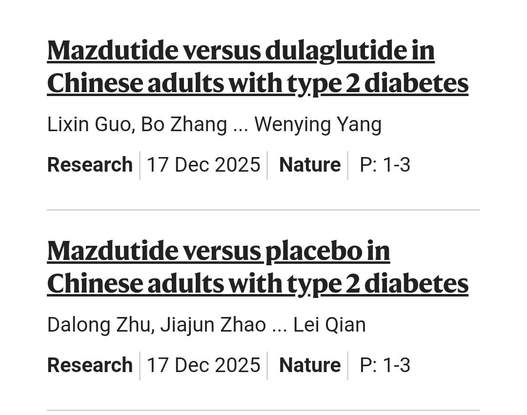12月17日,国际学术期刊《自然》同日刊登玛仕度肽两项临床研究成果,分别为《玛仕度肽与度拉糖肽在2型糖尿病中国成人患者中的对比研究》及《玛仕度肽与安慰剂在2型糖尿病中国成人患者中的对比研究》。该研究由我国代谢领域顶尖医院、科研机构与创新药企信达生物合作完成。这是《自然》首次在代谢和内分泌疾病领域“背靠背”同步发表两项三期临床研究成果。