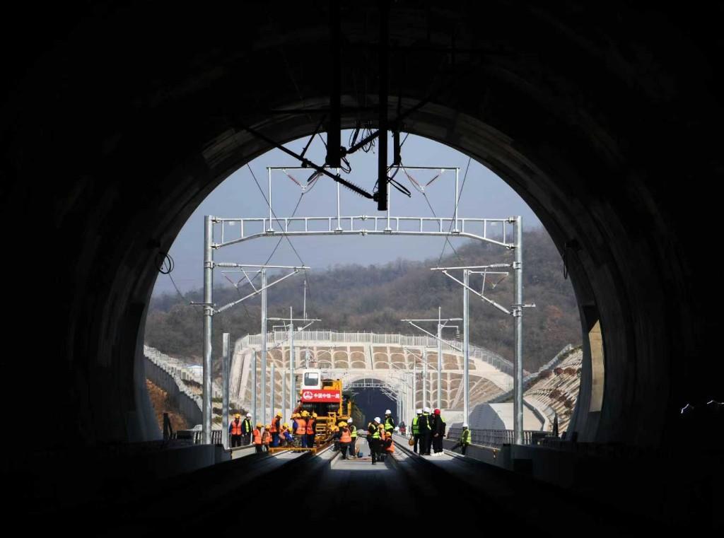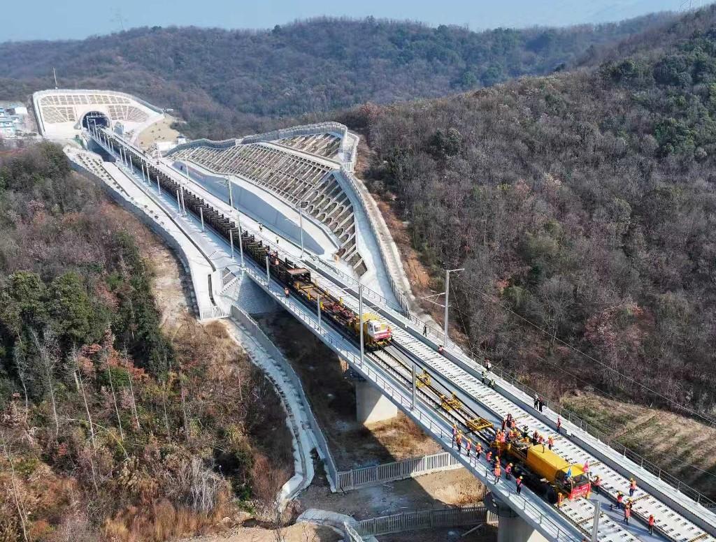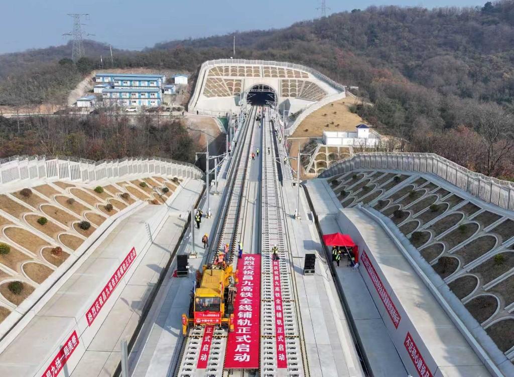 12月19日,在江西九江柴桑区的昌九高铁尖山岭隧道铺轨施工现场,铺轨车将第一对500米长钢轨平稳铺设到位,标志着昌九高铁正式进入全线铺轨阶段。