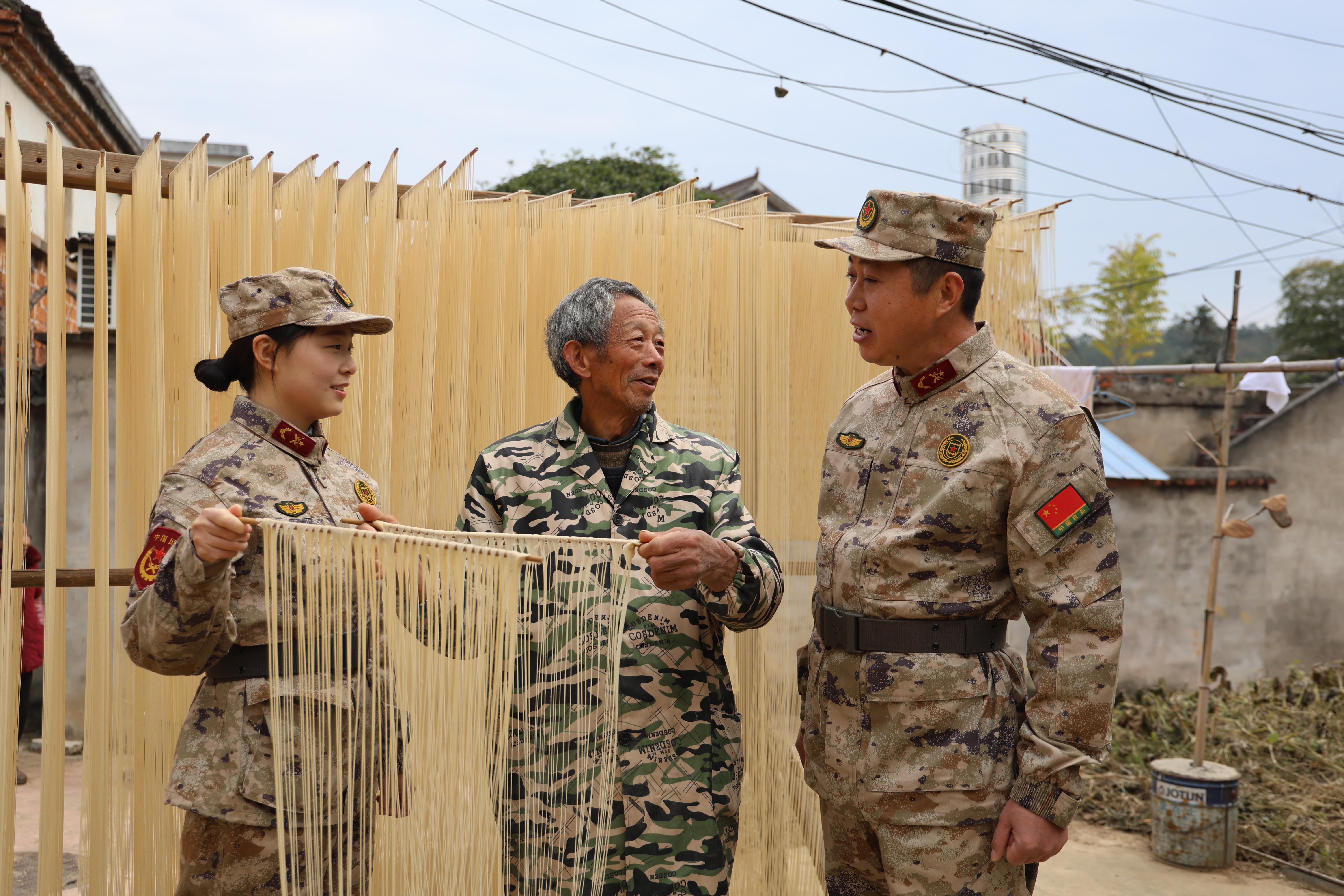 近日,安徽省庐江县泥河镇民兵助农小分队深入洋河村,帮助农户进行手工挂面晾晒、分拣和包装,助力乡村特色农产品产销。