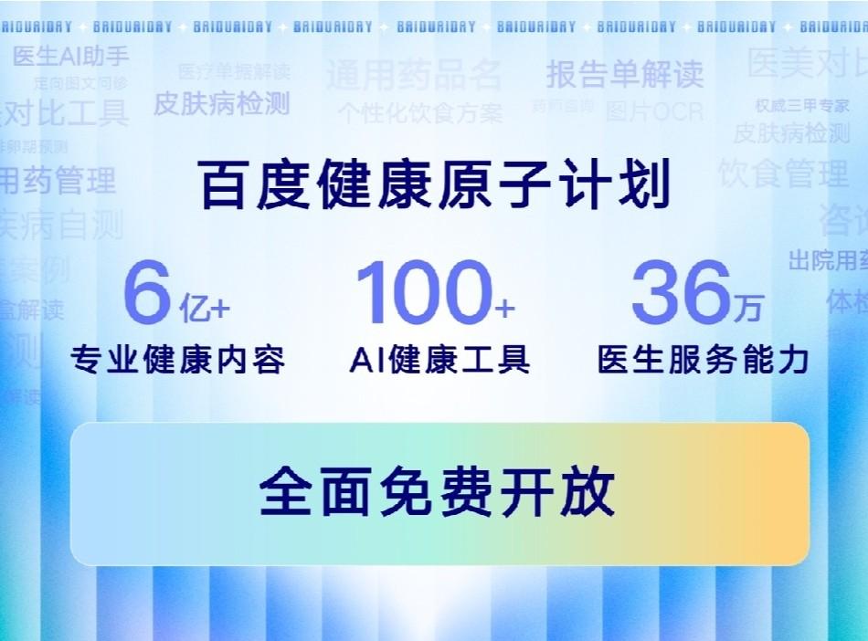 12月17日,百度健康在AI DAY上集中发布文心健康管家升级、原子开放计划和Dr.Flow创作平台三大成果,以AI技术为核心,构建覆盖用户健康管理、行业能力共享、健康内容创作的全链条服务体系,助力实现健康普惠目标。
