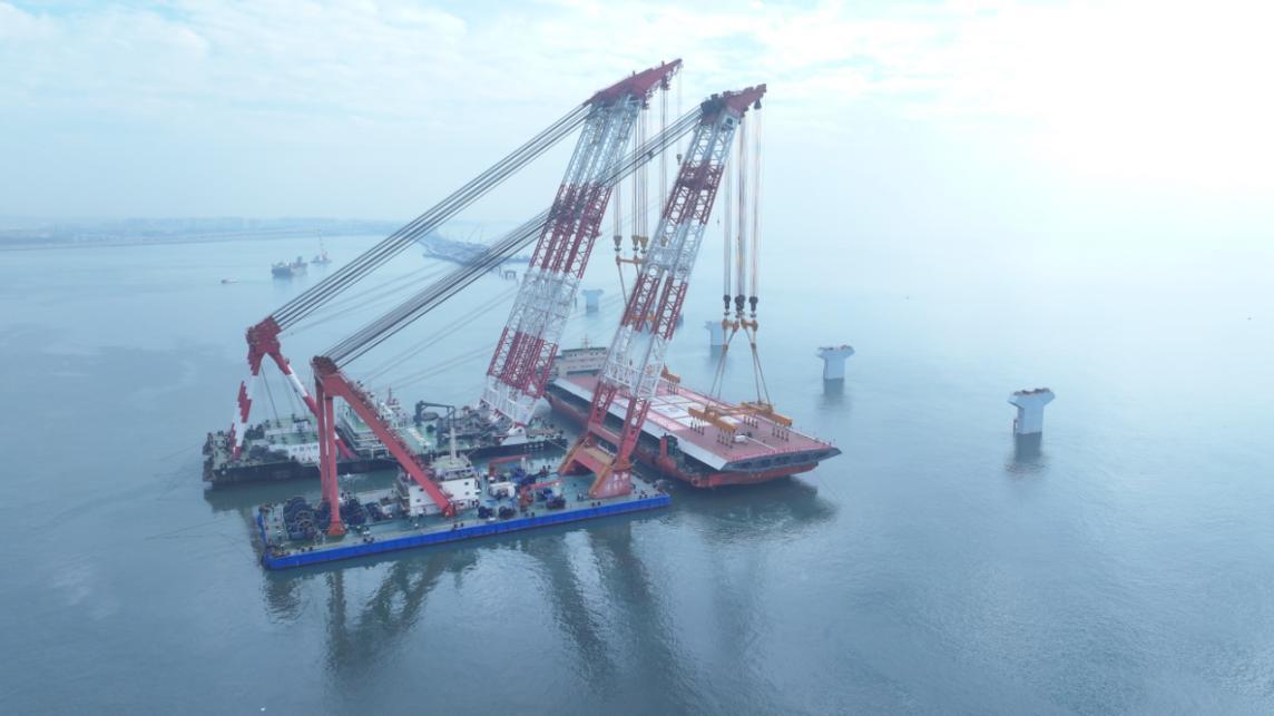 项目参建方介绍,为实现大节段钢箱梁安全高效精准架设,项目团队自主研发三项关键技术:一是研制了一种全桥通用钢箱梁吊具,吊具与钢箱梁吊点之间采用柔性连接,使吊具和钢箱梁吊点都能平稳均匀受力;二是研发了一套监控系统,每秒反馈一次监测数据,在架梁过程中全程监测两艘浮吊状况,以及全程监测吊具和钢箱梁在空中的姿态与受力状况;三是研制了一种1500t级大吨位三向调节装置,钢箱梁精调过程中,从纵桥向、横桥向、高程三个方向逐一同步调整钢箱梁位置,同步偏差不超过2mm。在智能监测系统的全程护航下,经过5小时13分钟的吊装作业和1小时20分钟的精调作业,最终钢箱梁毫米级精准架设顺利完成。