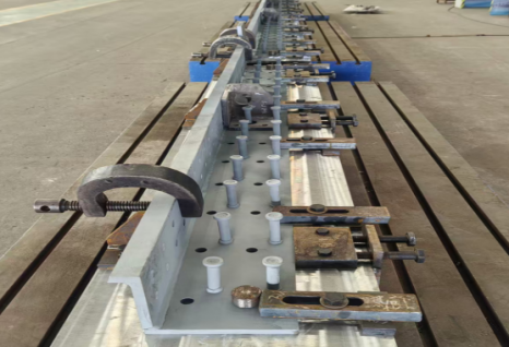 面对无成熟经验可循的挑战,项目团队攻关多项核心技术,以毫米级精度把控质量。构件制作中,研发专用工装与加工工艺,解决L型预埋件焊接变形难题,实现了毫米级精度的管控;钢主梁工厂制作尺寸合格率达100%,节段拼装直线度偏差≤3mm,孔群对位偏差≤1mm。现场施工采用主梁快速拼装、高精度叠合等技术,单个节段拼装仅需2天,短尾环槽高强拉铆钉安装几十秒即可完成,且适应-40℃至80℃宽温度范围,不仅提升了连接质量与抗振动、防松动性能,更显著提高了生产效率。