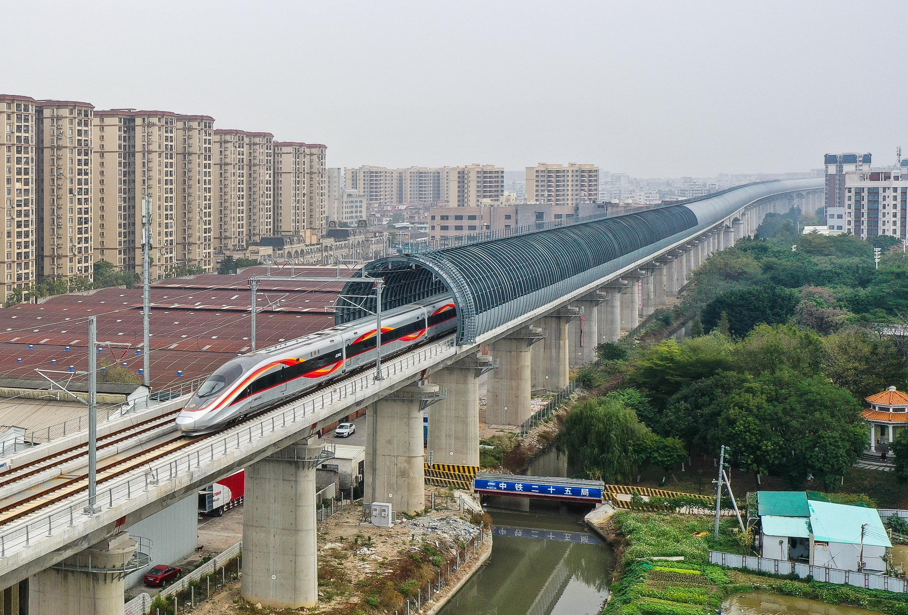 飞驰的列车上,欢声笑语不绝于耳。车厢内,显示屏实时跳动着350公里的时速。窗外,岭南田园、城镇乡村飞速掠过。