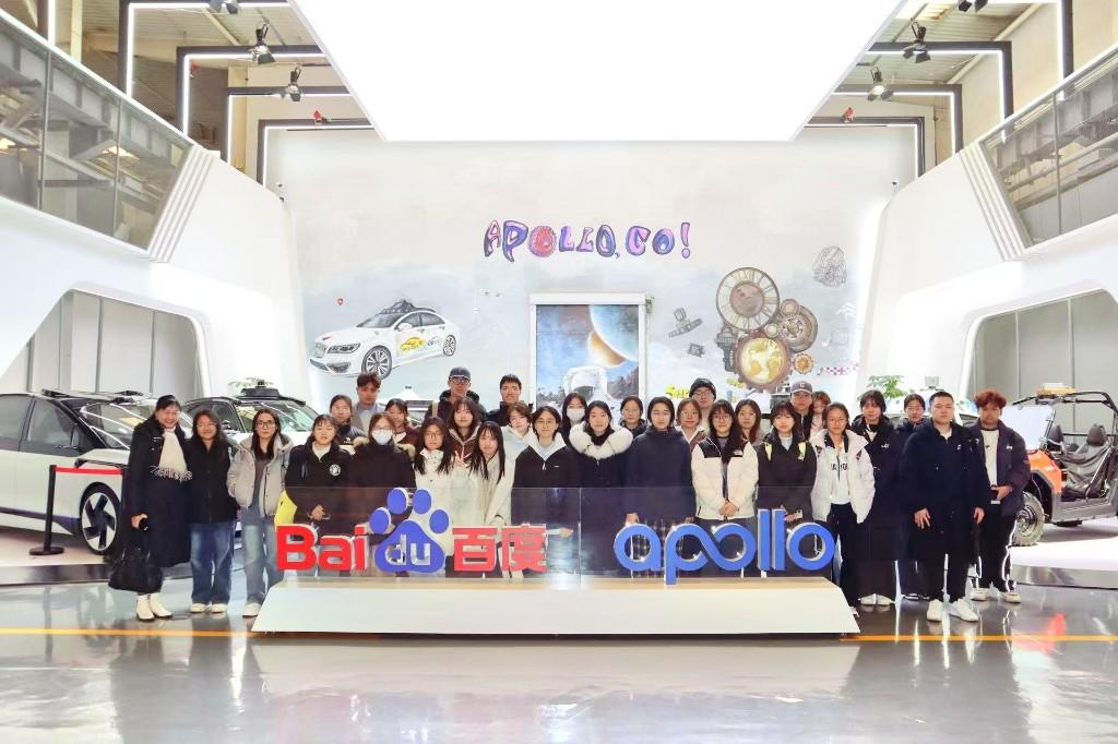 在百度Apollo Park,学生们深入了解百度六代自动驾驶车辆的研发历程、性能亮点与荣誉成就,并分批试乘第六代产品“萝卜快跑”。车辆平稳智能的行驶表现,以及加热按摩、K歌等丰富功能,给师生们留下深刻印象。在参观过程中,学生们边看边拍、积极提问,围绕经开区人工智能产业扶持政策、实践教学意义等内容展开采访记录,将课堂所学的新闻采写知识转化为实践能力。