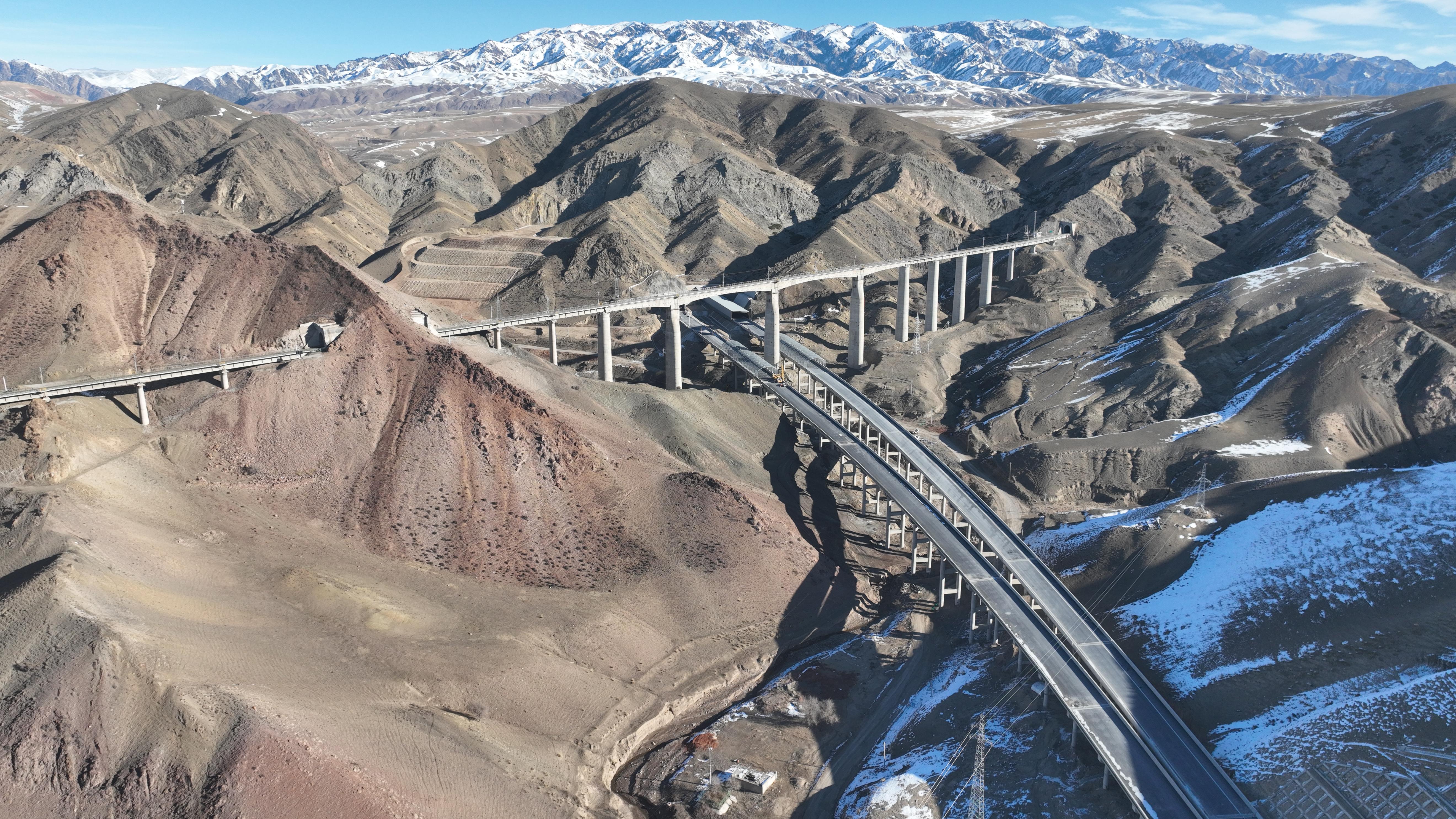 精伊高速全长92.545千米,由北向南,穿戈壁,越河谷,直插北天山腹地。这一路,地形起伏剧烈,地质构造复杂,49.1%的桥隧比意味着近一半的线路要在桥梁与隧道中延伸,相当于在天山之巅“穿针引线”。