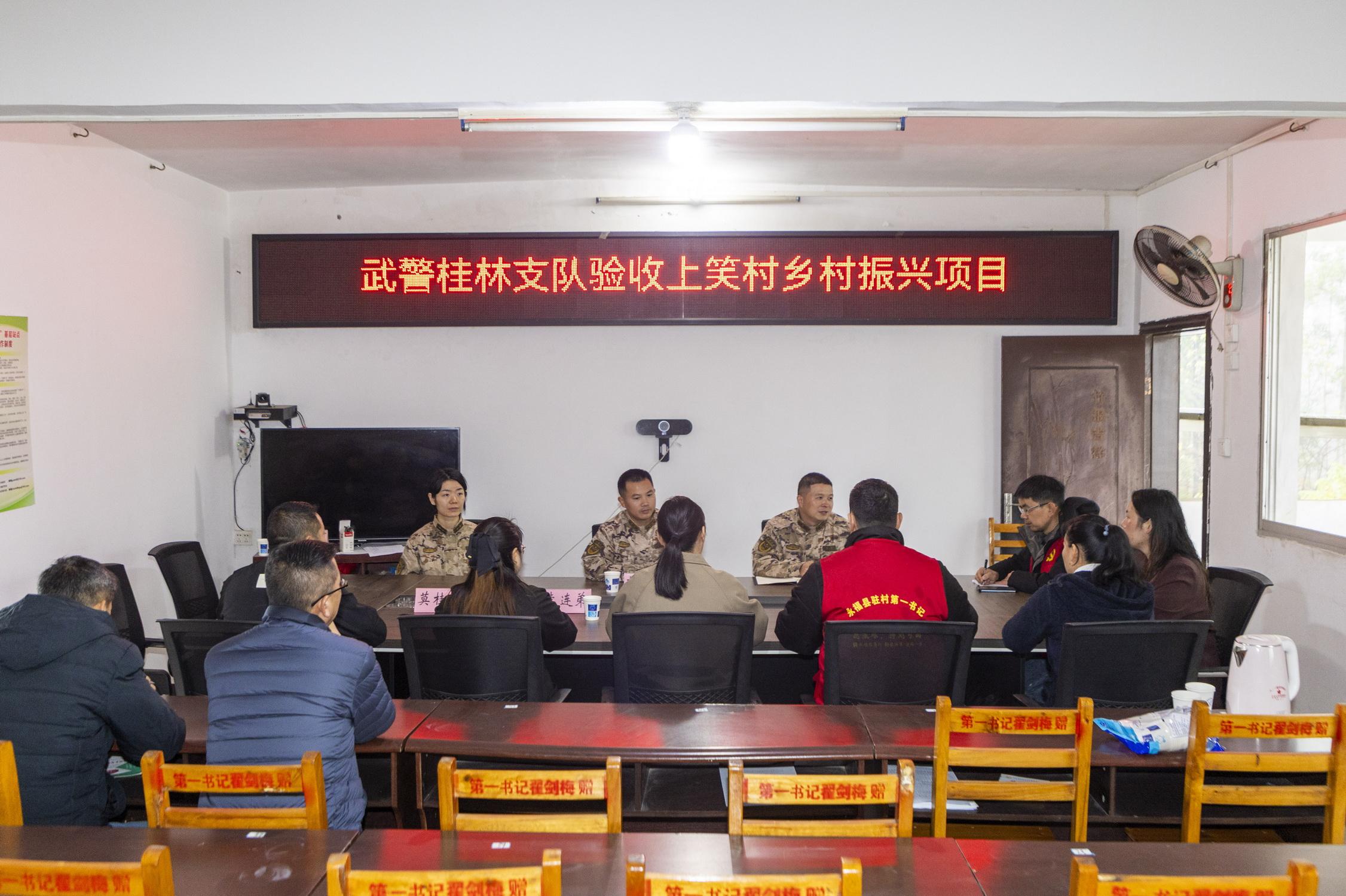 近年来,该支队积极响应乡村振兴战略号召,与永福县罗锦镇上笑村、临桂区两江镇高妙村建立结对帮扶关系,帮助贫困村焕发出勃勃生机。上笑村地处山区,交通不便、产业薄弱等问题长期制约着村庄发展。武警桂林支队乡村振兴小组先后多次带队深入村里调研,走访困难群众家庭,并通过“帮扶结对、部队搭台、村委统管”的方式投入专项资金进行帮扶。这些年,该支队先后帮扶上笑村、高妙村建设完成环村道路3公里、文体活动中心2个、新建饮水工程1个。