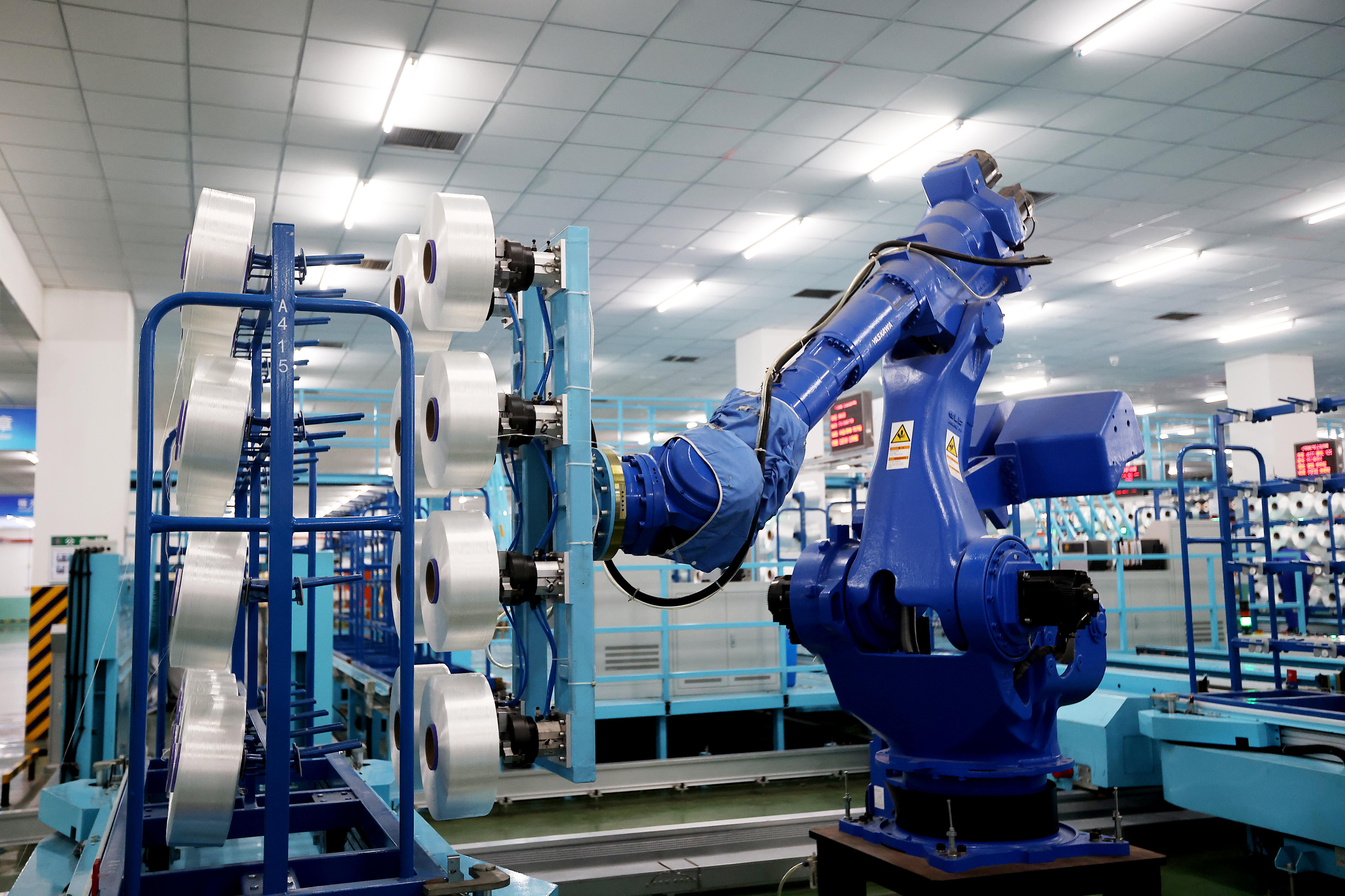 走进恒力化纤的国家级卓越级智能工厂车间,机械臂精准操作,无人搬运车有序穿梭,从切片增粘到入库的全流程在智能调度下高效作业。