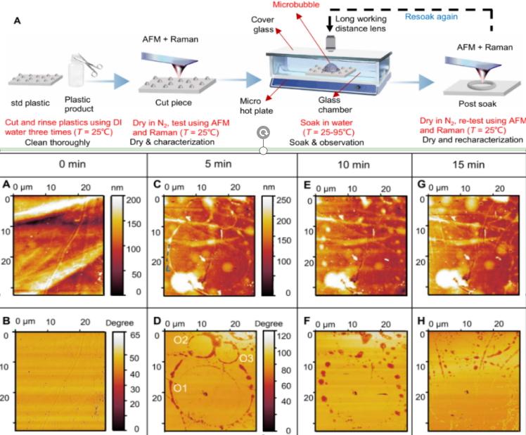 该研究成果解析了典型水环境条件下塑料表面自发形成微气泡过程,并揭示其诱导界面侵蚀驱动微塑料与纳塑料释放机制,为准确评估饮用水及天然水体中微/纳塑料污染的形成过程与控制措施提供了理论支撑。