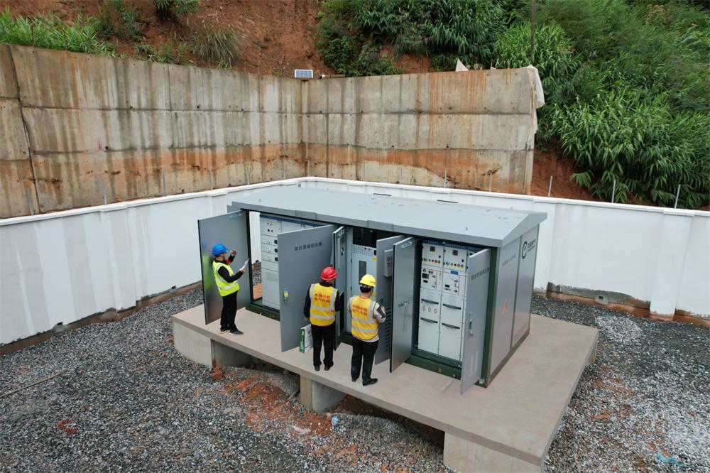 柳梧铁路桥隧比高达72.5%,沿线地质地形复杂,设备运输与安装面临显著挑战。为确保首批箱变顺利进场并一次吊装成功,项目部提前谋划,统筹协调设备供货,专门制定了运输与吊装方案。作业前,技术人员对变电站基础进行了全面检测与清理,确保其强度及养护期符合设计要求。吊装过程中,现场指挥统一,岗位责任明确,全程操作规范、衔接有序,实现了安全、精准、高效的安装目标。