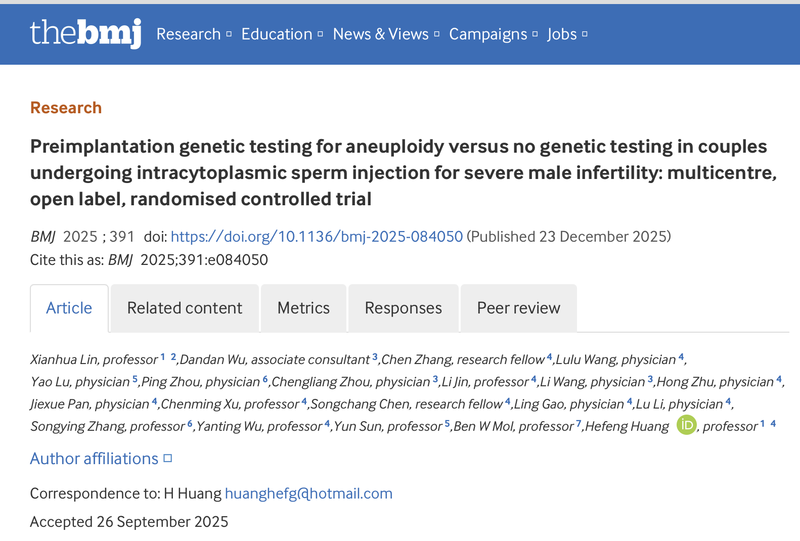12月23日,《英国医学杂志》在线发表了中国科学院院士、浙江大学生殖遗传教育部重点实验室主任、浙江大学医学院附属妇产科医院名誉院长黄荷凤领衔的一项突破性研究发现:在严重男性不育患者中,PGT-A技术并未展现出提高活产率的优势。