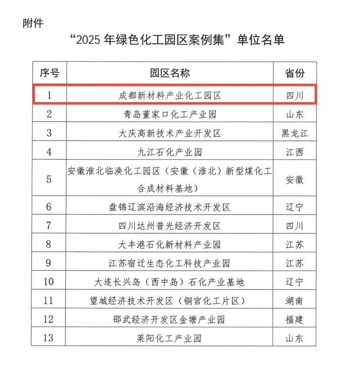 12月23日,中国石油和化学工业联合会发布“2025年绿色化工园区案例集”名单。其中,位于成都彭州市的成都新材料产业化工园区正式被纳入“2025年绿色化工园区案例集”。