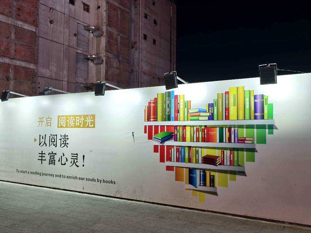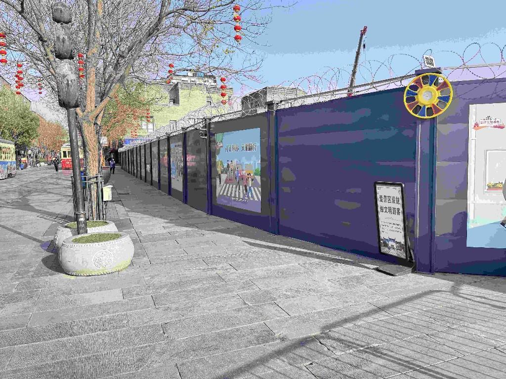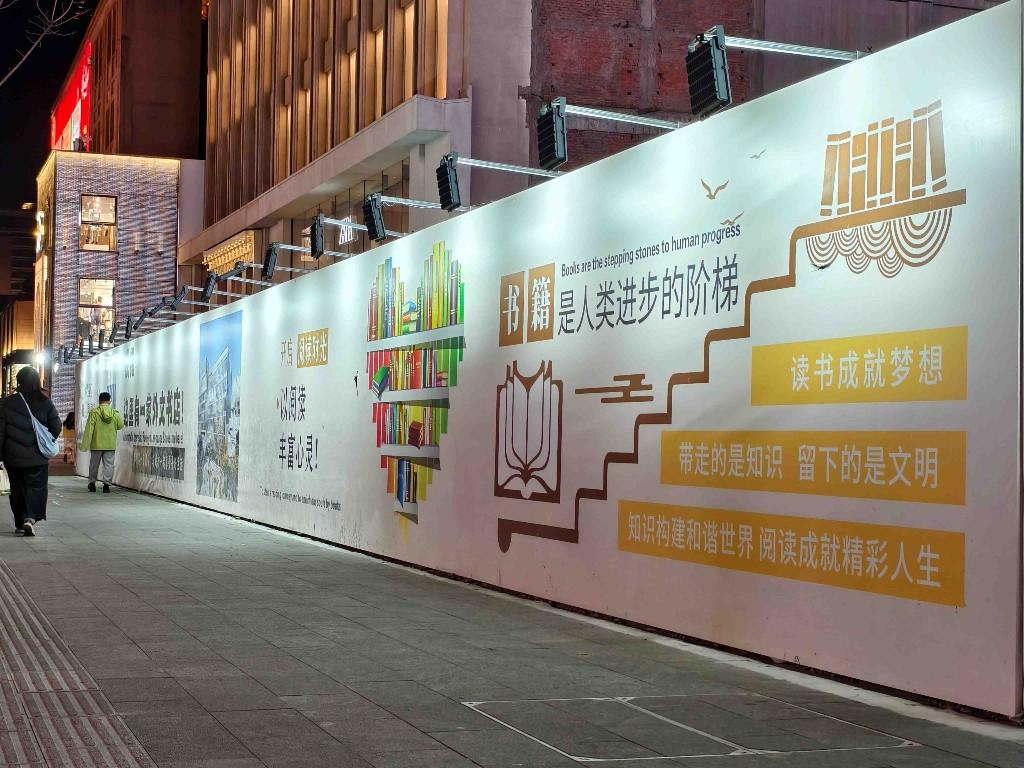 王府井步行街上,外文书店升级改造的围挡化身露天艺术长廊。围挡上的宣传画呼应书店文化底蕴,入夜后灯光亮起,图文在光晕中浮现,既打破施工沉闷感,又以“无间断封闭”特性守护行人安全,为商圈夜色增添诗意。这一设计秉持“安全为基、美观为形”理念,让建设过程成为文化预告,缓解了施工对城市视觉的影响。