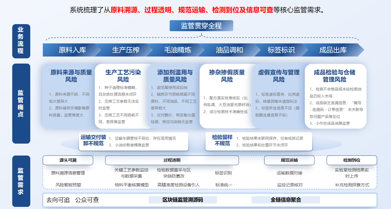 食用植物油的质量安全维系着亿万消费者的健康,但其生产过程中存在生产链条长、信息分散、溯源困难等问题,产业整体也缺乏统一的信息数据标准、信息共享机制。江南大学正在建设的“食用植物油产业发展与智慧监管平台”,使用了多学科理论与技术方法,使之成为有效的“监管工具”,同时通过建设食用植物油监管“数据底座”,实现吃得放心、吃得安心目标。目前,此项工作取得积极进展。