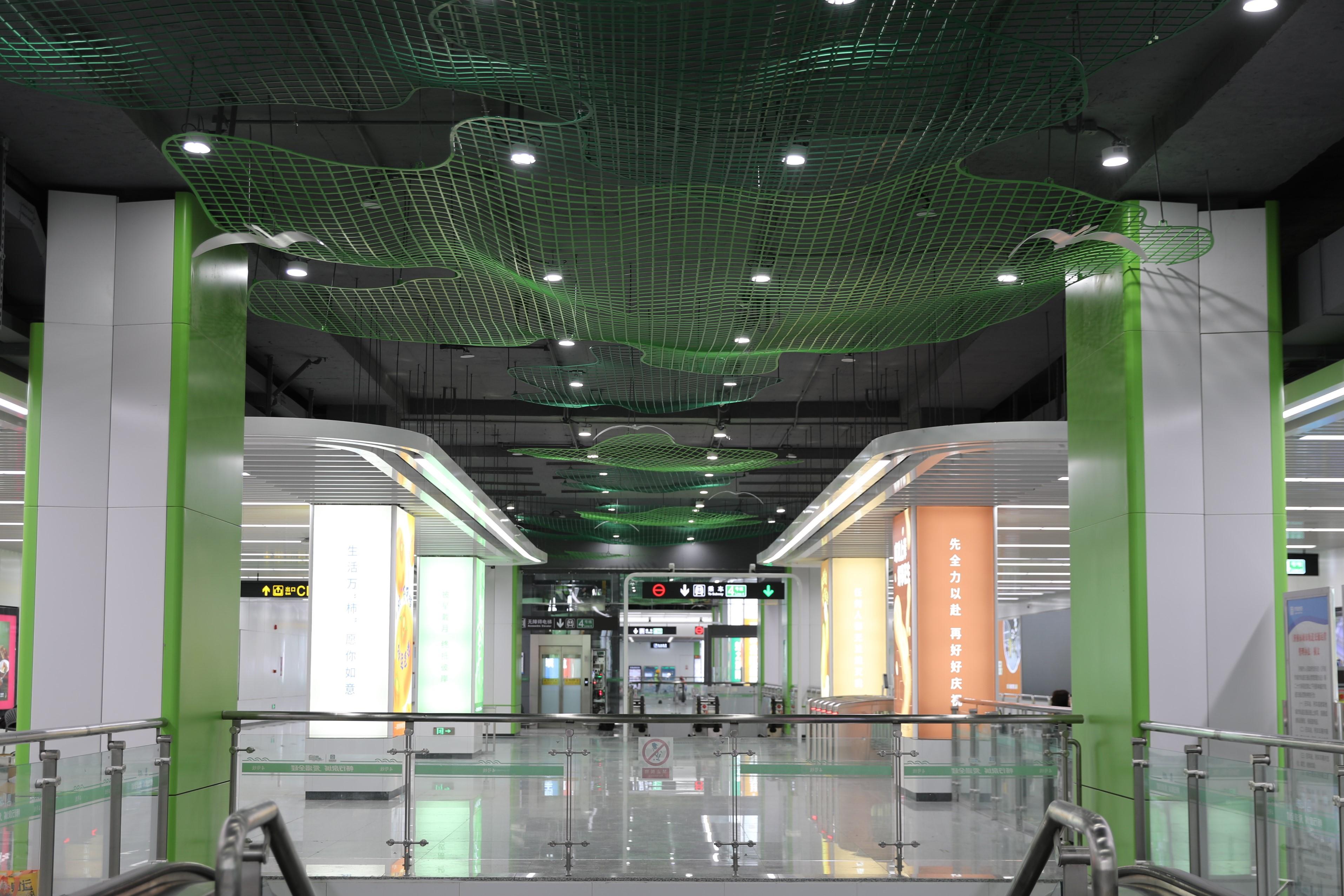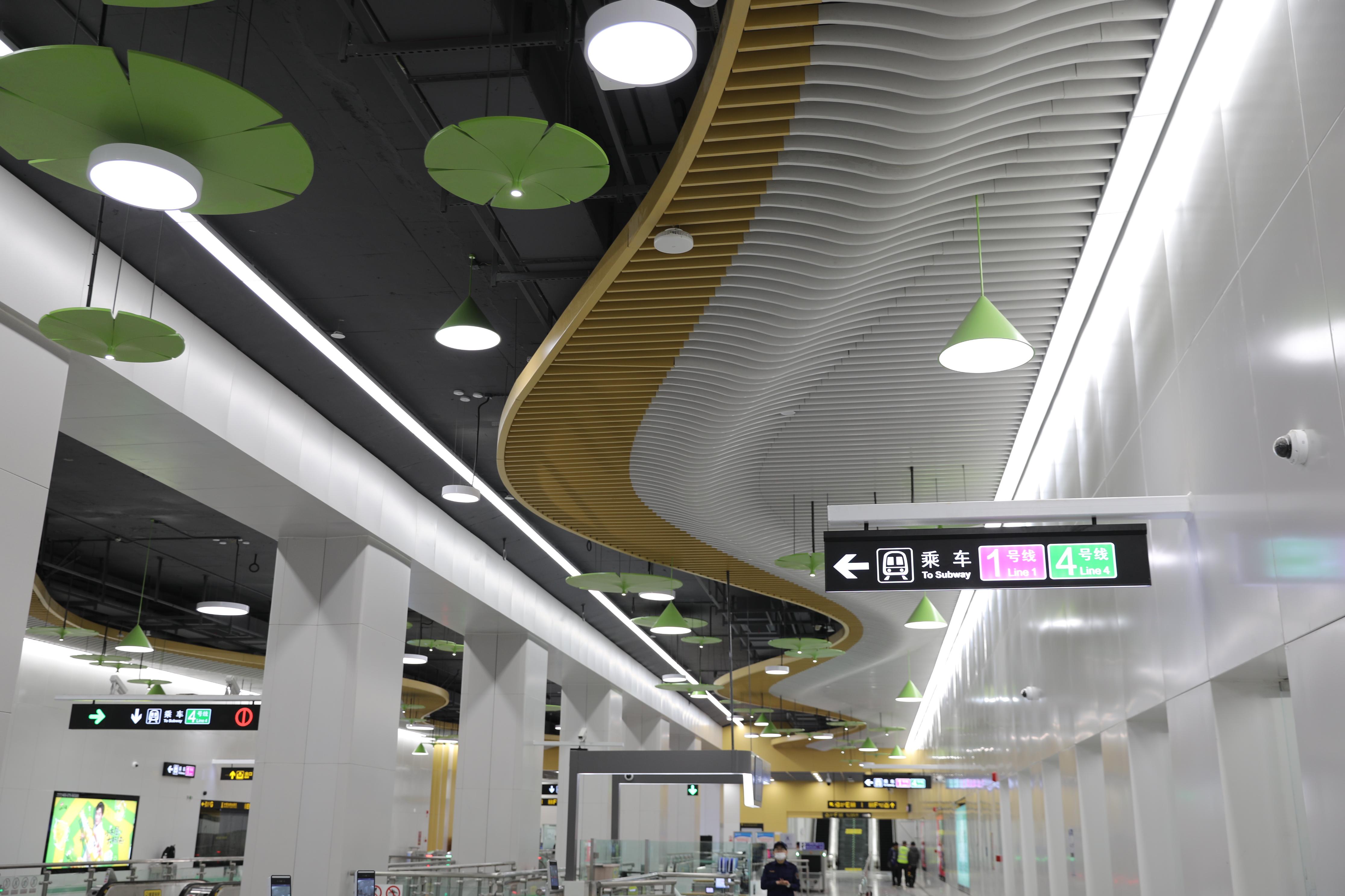 济南地铁4号线还是一条承载城市文脉的“地下文化长廊”。线路以“山绣齐青”为核心理念,将济南的自然人文特色深度融入各车站空间设计。例如,大杨站紧扣“泉·荷”主题,将垂直吊灯与荷叶造型装饰结合,配合波纹状的吊顶造型,营造出泉城大明湖畔荷叶连连的诗意氛围。据了解,“荷叶灯”接入智慧照明系统,可根据人员密度、昼夜情况等自主调节开关状态,有效减少能源消耗。