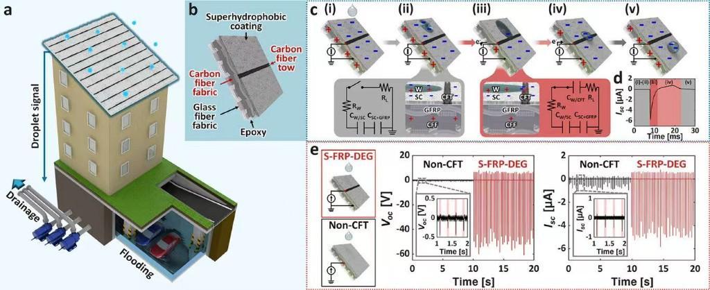 韩国蔚山国立科学技术研究院研究团队研制出一款以碳纤维增强聚合物(CFRP)为核心的雨滴发电机。该装置可将雨水冲击屋顶的动能转化为电能,为暴雨期间的自动排水与洪水预警系统提供自供电支持。相关研究论文发表于《先进功能材料》杂志。