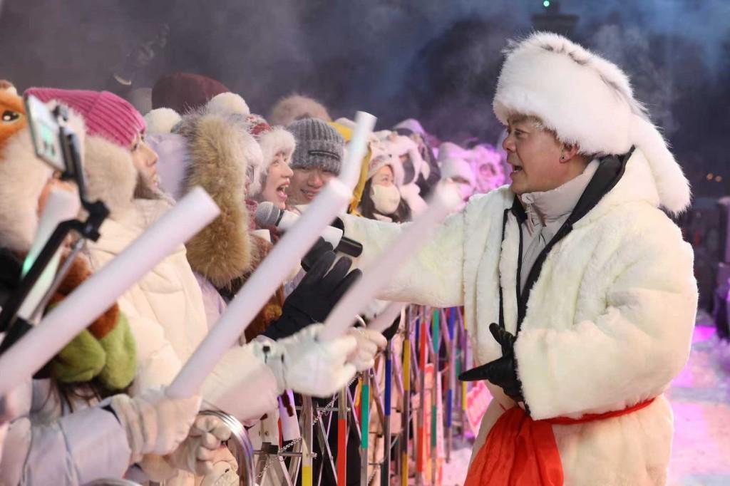 潮流与民俗的碰撞让跨年夜更具看点,《泼洒梦想》《要爱你就来》等歌舞表演点燃全场热情,荧光棒点亮夜空。随后,《小拜年》等东北二人转经典选段轮番登场,演员们手持手绢、扇子载歌载舞,现场欢声笑语弥漫。