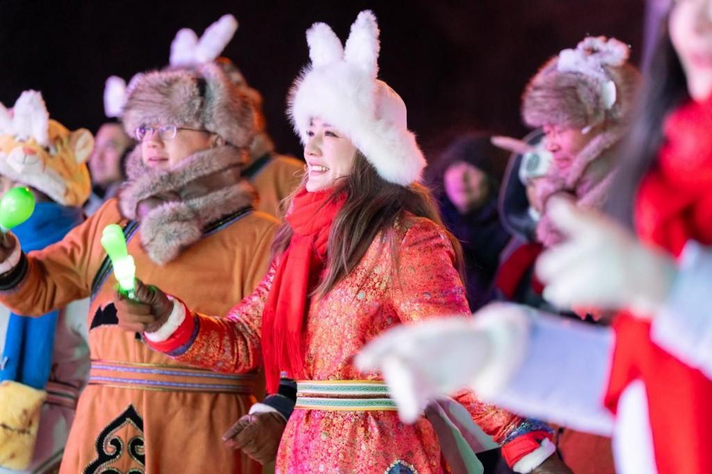 白天,冰雪乐园里的欢声笑语、街头快闪的惊喜表演、年货采购节的热闹吆喝,为夜晚的盛宴铺垫了温暖的基调。夜幕下,身着鄂伦春族、达斡尔族民族服饰的同胞,远道而来的俄罗斯游客,以及天南地北的旅人齐聚一堂,共赴这场边境狂欢。主持人一句俄语“Привет!(你好!)”,瞬间点燃俄罗斯游客区的热烈呼应。