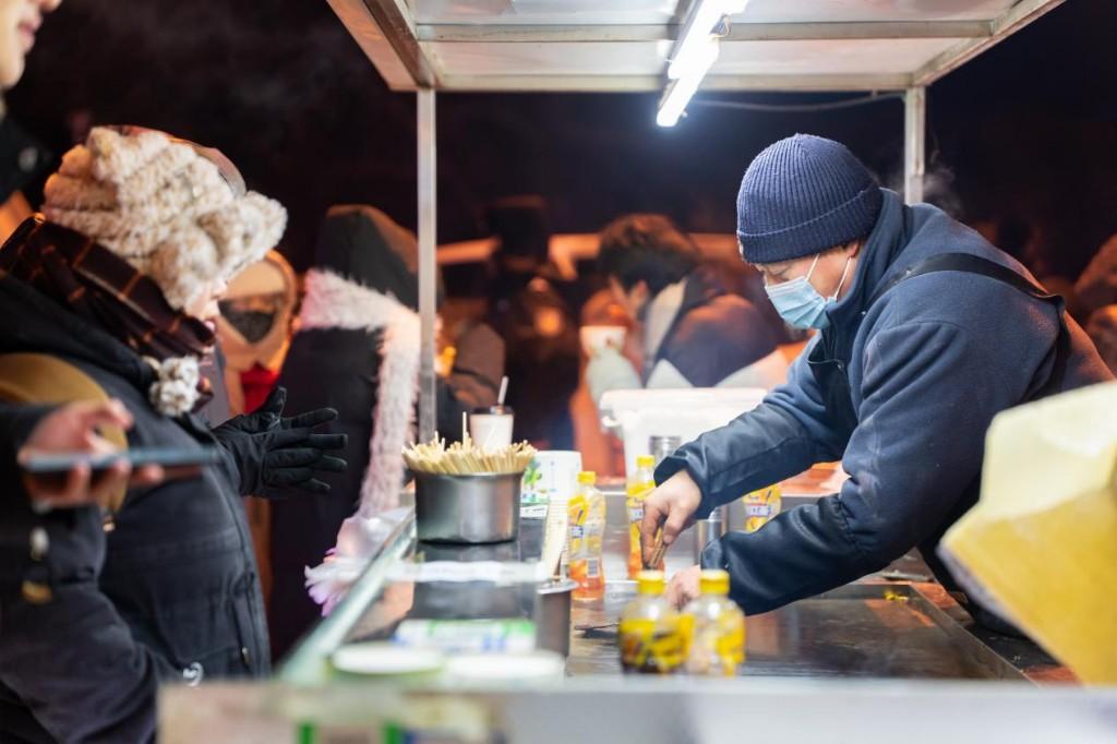 歌声未落,暖意已从舞台蔓延至广场四周——跨年夜市正升腾着迷人的烟火气。中俄特色风味在此交融碰撞,俄式大串滋滋冒油、东北锅包肉色泽金黄……刚出锅的热乎滋味裹挟着香气弥漫全场,“好吃,这里的食物我都很喜欢。”俄罗斯游客亚历山大咬了一口烤串,用略显生硬的中文笑着说道。
