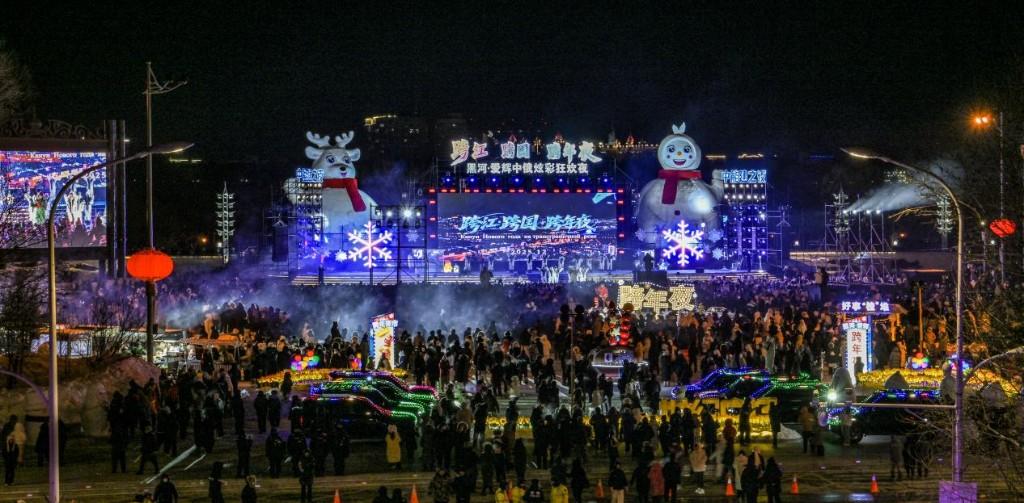 2025年12月31日晚,黑龙江黑河世纪广场灯光璀璨、人潮涌动。“跨江·跨国·跨年夜”系列活动点燃冬夜热情。