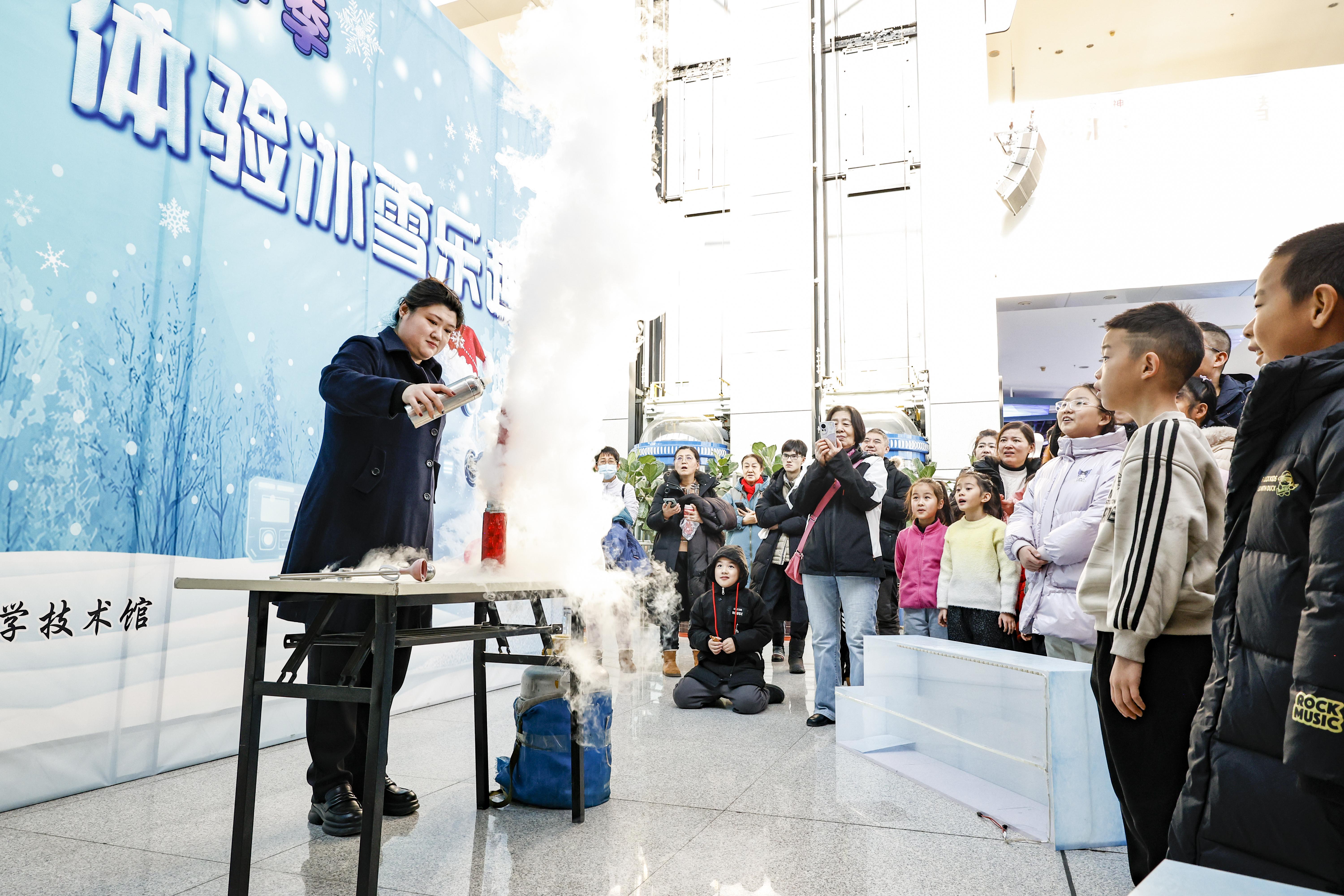 新年特别活动更是人气爆棚。“科技非遗 印记新年”活动现场,多组亲子家庭围桌而坐,以环保宣纸为笺、天然彩墨为媒,拓印植物纹理之美,让古老非遗技艺与自然科学精妙交融;三层水世界展区的“冰趣小课堂”上,低年级小学生们轻触通透冰料,在科技老师的生动讲解中洞悉冰的导热特性,亲手打造专属迷你冰灯,沉浸式感受冰雪文化的独特魅力。中厅的冰雪科学秀堪称全场“人气王”,趣味冰雪小实验现场“造雪”,漫天飞舞的“雪花”营造出唯美梦幻的氛围,引得游客们纷纷举起手机定格这一神奇瞬间。“在室内亲历‘下雪’,还能学到科学知识,太奇妙了。”游客们赞不绝口。