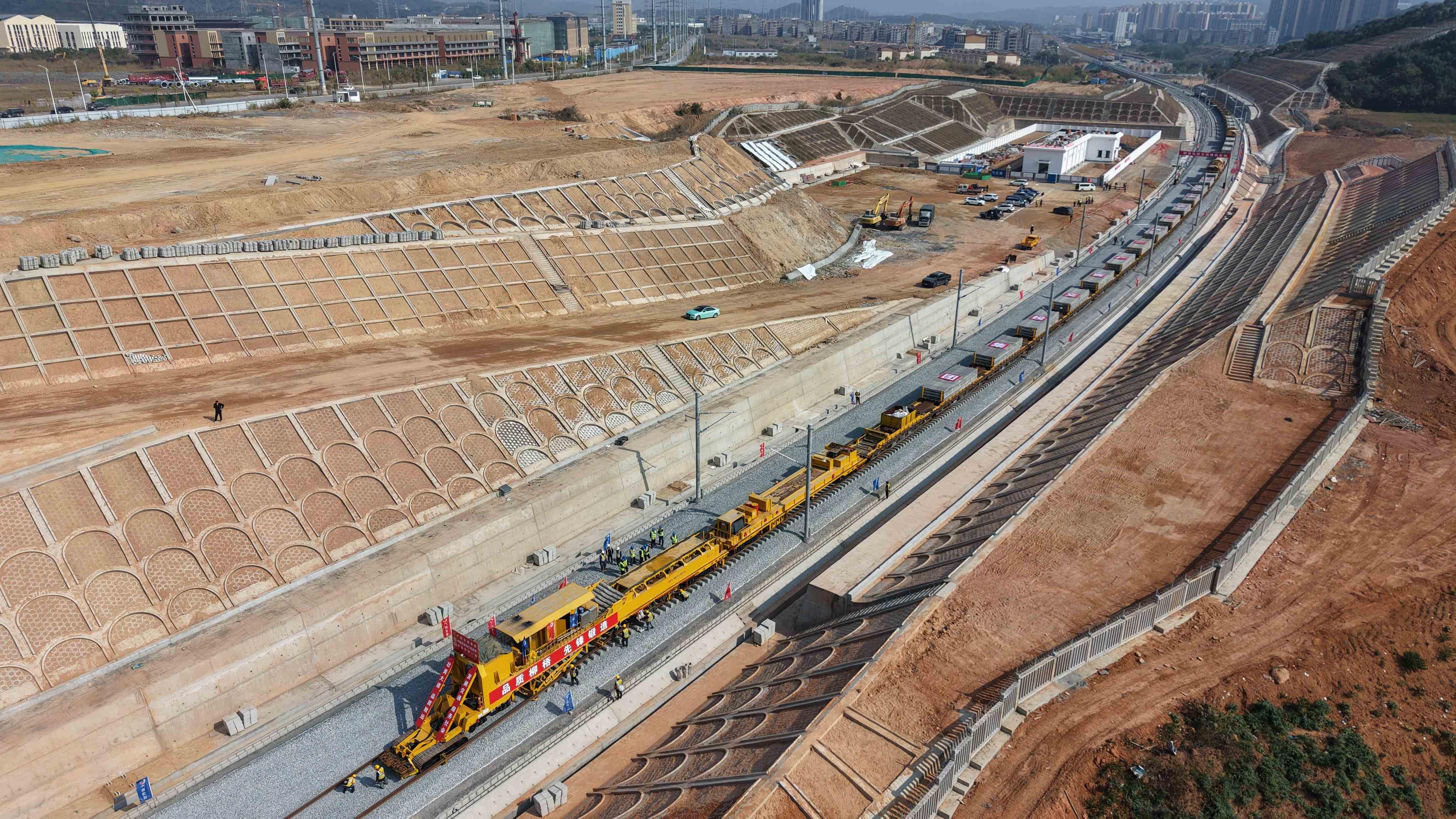 据介绍,面对实际挑战,项目团队组建由铺轨、桥隧、测量等标段组成的联合踏勘组,对沿线所有桥隧工程开展拉网式调查。踏勘过程中,团队实地核查全线路基、桥梁、隧道工程开展情况,创新采用无人机航拍勘测模式,精准获取全线地形地貌信息。为保证铺轨作业的连续性和稳定性,项目建设团队优化施工方案,调整资源配置,全程采用双机分区联合作业模式,配备钢轨运输车4列,在有砟轨道段落依托我国自主研发的CPG500型铺轨机组高效作业能力,采用“单枕连续法”进行铺设;在无砟轨道段落使用WZ500E型铺轨机采用“推送法”进行铺设。同时通过搭建数字化调度指挥中心,实时采集铺轨机组运行状态和线路数据,有效地解决了复杂地形造成的信号盲区难题,实现施工全周期安全闭环管理。