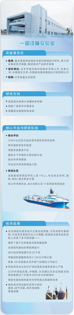 2025年3月19日成立的江苏省海底通信与感知重点实验室,就是一个致力于铺设“海底信息高速公路”和探索“海底感知智能观测网络”的“科创高地”。该实验室由江苏亨通华海科技股份有限公司(以下简称“亨通华海”)、东南大学、中国海洋大学以及中国移动通信集团设计院有限公司四家单位联合共建。