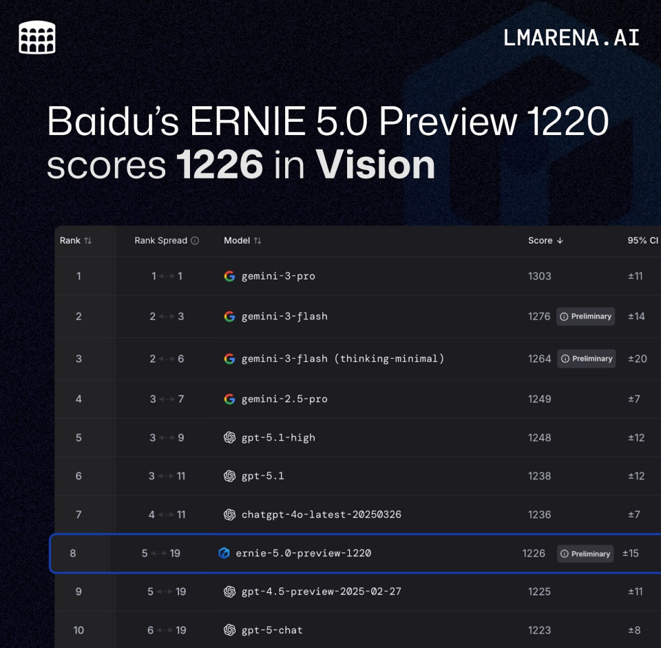 1月8日,全球权威大模型评测平台LMArena公布最新排名,文心大模型ERNIE-5.0-Preview-1220以1226分的成绩,登上LMArena视觉理解榜(Vision Arena)中国第一、全球第八,是该榜单中唯一进入全球前十的中国大模型,实现了国产模型在多模态视觉理解方向的阶段性突破。