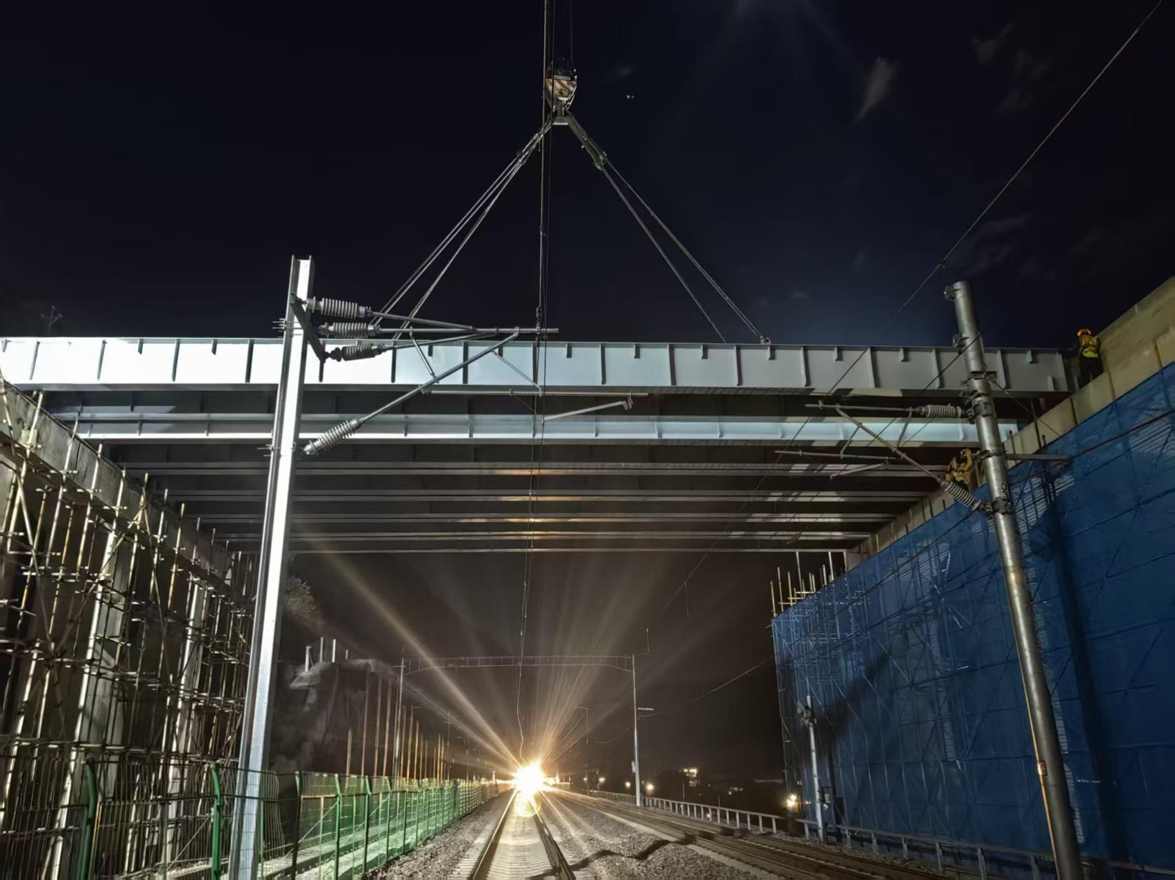 为确保吊装作业绝对安全,项目部精确计算施工用时,精准上报封锁计划,并严格按照铁路部门批准的“天窗点”组织施工,同步实施接触网停电以及接触网铠装护线条保护,从根本上避免了吊装机械、构件与带电接触网之间可能发生的安全风险。停电期间,项目部与供电单位紧密配合,执行既定的停送电程序与安全监护,确保施工全程处于受控状态。同时,项目部对钢梁加工精度和焊缝质量进行严格把关,确保钢梁尺寸满足设计要求、焊缝一次检验合格率100%,为钢梁顺利吊装打好坚实基础。