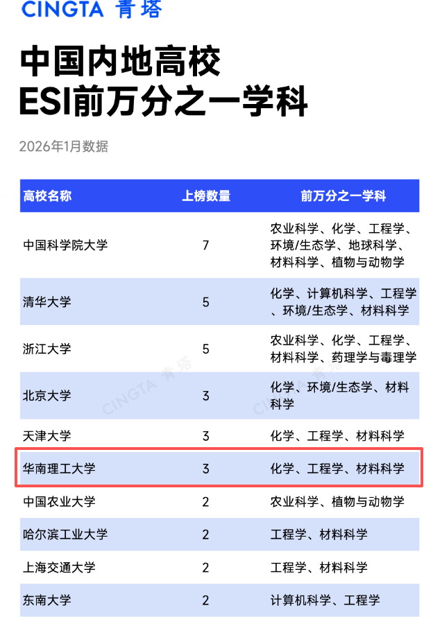 这是华南理工大学继工程学、化学后,第3个进入ESI全球前万分之一的学科。第三方统计显示,华南理工大学3个学科入选ESI万分之一,稳居内地高校并列第四位。