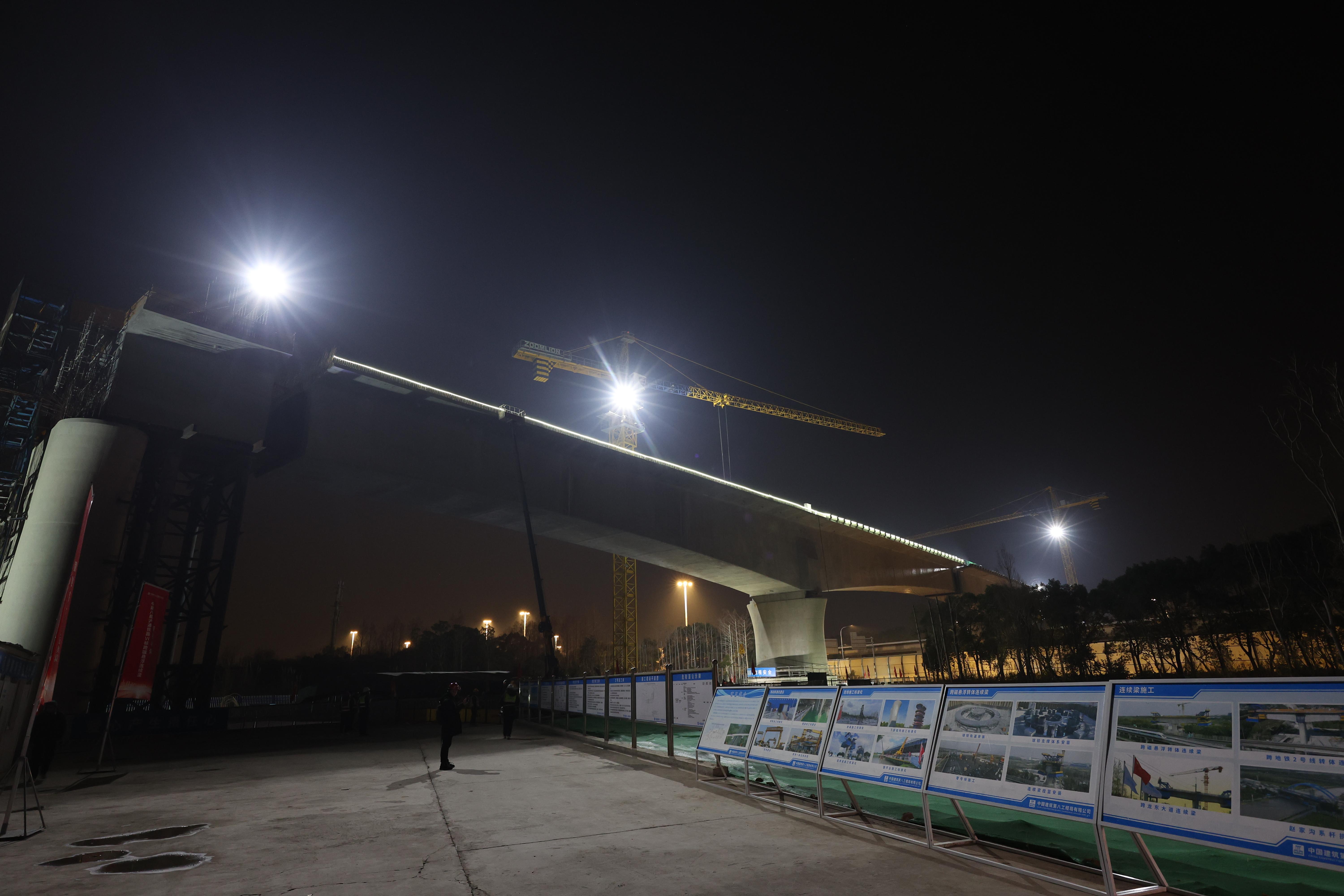 1月8日23点30分,科技日报记者在现场看到,用时1小时,由上海国铁建管公司负责建设管理、中国建筑第八工程局承建的沪苏通铁路二期(太仓至四团段)控制性工程——川沙特大桥跨磁浮线连续梁成功实现转体。该工程是国内首例在高速磁浮运营线路上方实施的大跨度连续梁转体施工,标志着沪苏通铁路二期建设取得关键进展,为后续铺轨奠定了坚实基础。