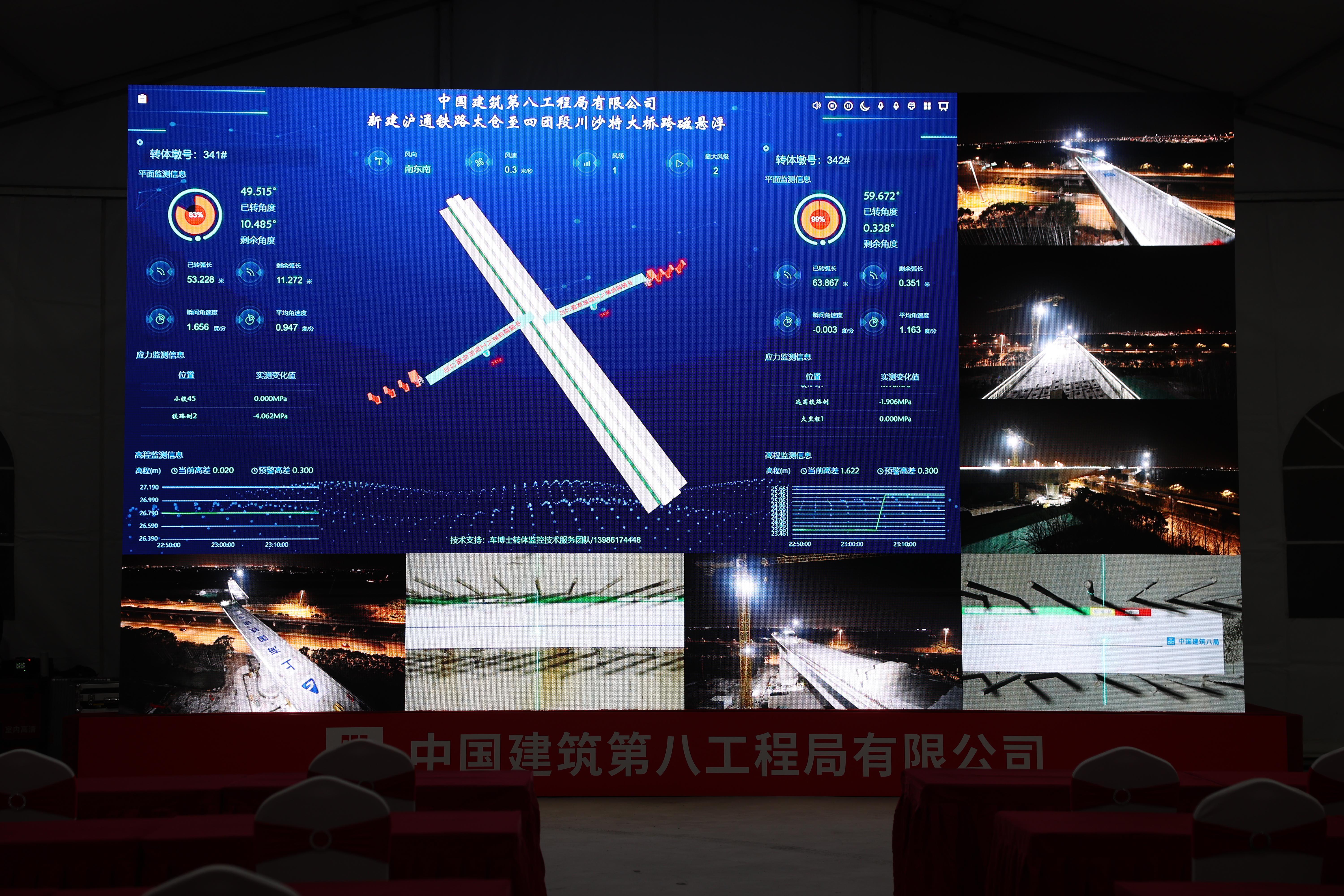 为攻克技术难题,项目团队联合磁浮线运营、交通管理等单位创新建立“磁浮安全守护”联动机制,采取“天窗点精准施工+实时动态监测”管控模式,将转体作业严格限定在运营间隙,并全程同步监测轨道沉降与振动数据,确保对磁浮线“零影响”。面对大重量、高精度转体要求,团队运用智能连续转体系统,结合“模拟预控+实时校准”数字化方案,通过BIM技术预先模拟施工全过程,精准测算牵引力与转体速度;转体过程中,采用4台智能连续转体千斤顶同步牵引,配合千分表、全站仪等设备实时监测,最终将梁体轴线偏差控制在5毫米内,合龙接口误差小于2毫米,实现平稳精准转体。
