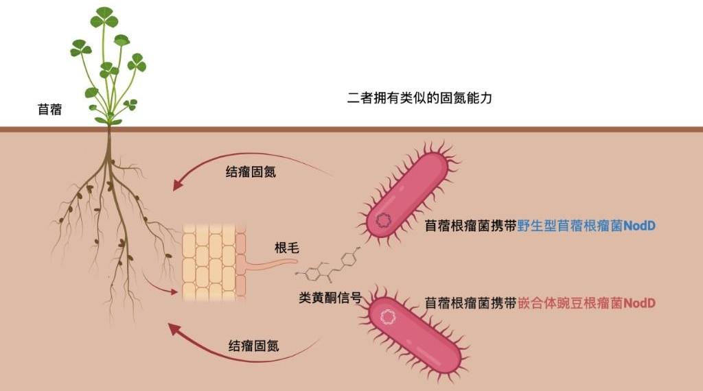 研究团队通过将苜蓿根瘤菌NodD中的三个关键激活域“移植”到豌豆根瘤菌NodD上,成功构建出一个“嵌合体”NodD蛋白,改造之后的豌豆根瘤菌NodD也能响应苜蓿根部分泌的类黄酮信号,并展现出和野生型苜蓿根瘤菌相似的结瘤固氮能力。这直接证明了正是这三个关键激活域,决定了豆科植物与根瘤菌之间的特异性识别。