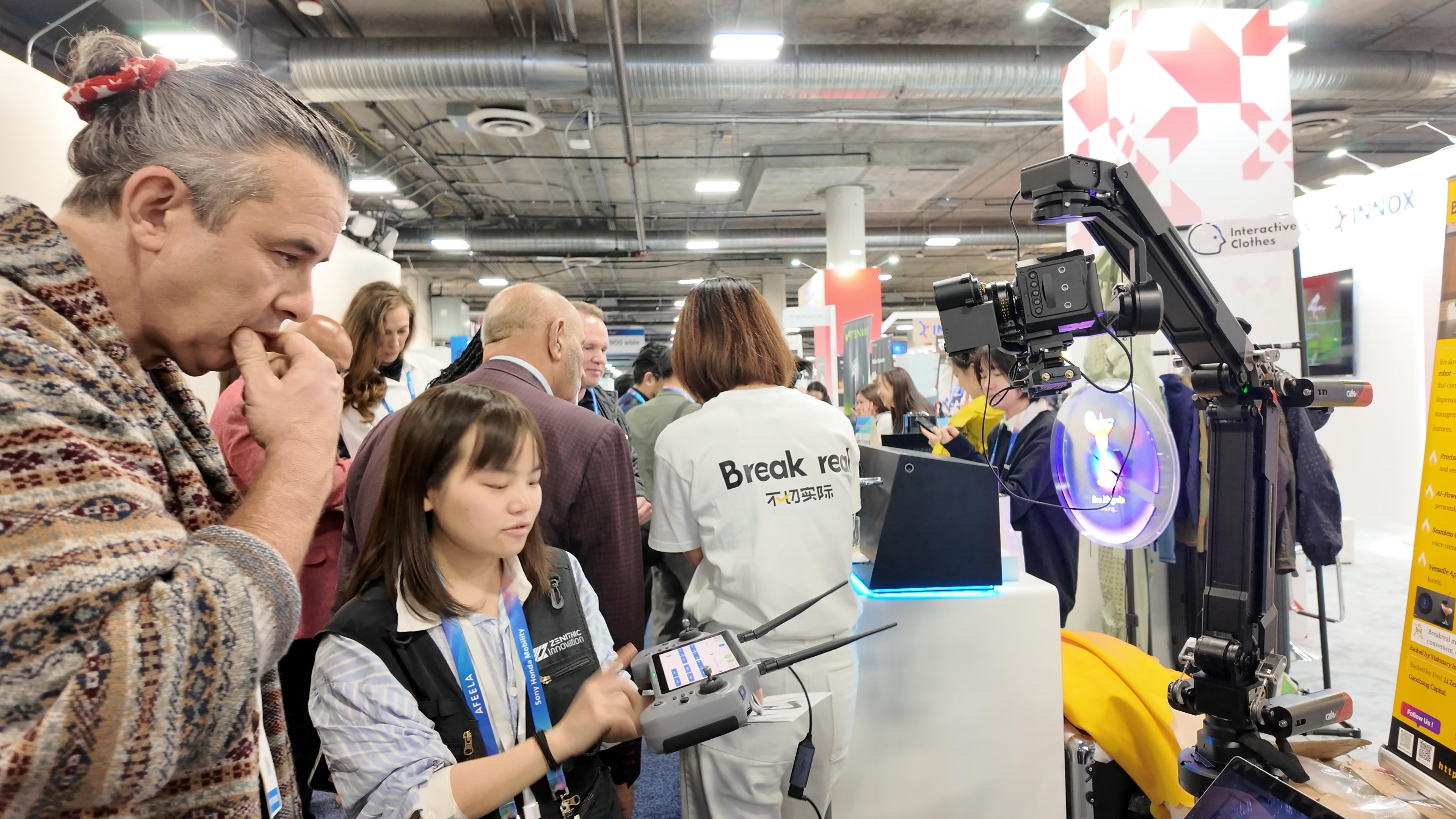 越千创新的随灵X桌面级智能运镜机器人将工业级摄影机械臂浓缩至桌面级大小,显著降低了专业运镜门槛,赋予视频创作者轻松产出高质感运镜的能力。在现场,被产品概念吸引的自媒体创作者不计其数。在操作演示中,展位负责人重点展示了其两大核心功能:智能AI追踪可自动锁定拍摄目标,实现平滑的主体跟随运镜;而“拖拽示教”功能则允许用户直接手动牵引机械臂录制运动轨迹,系统精准复现,实现“手把手教学”般的简易编程。