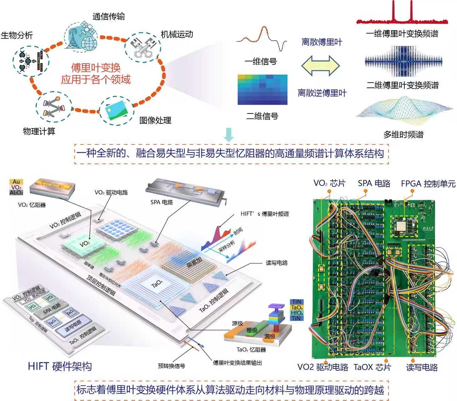 论文共同第一作者兼通讯作者、北京大学人工智能研究院研究员陶耀宇介绍,傅里叶变换作为AI领域的“底层引擎”,其核心功能是将复杂的信号(声音、图像、时间序列)转换为频率的语言。在人工智能中,这种能力被广泛应用于特征提取、降噪、压缩以及计算优化等方面。它是人工智能、通信系统、科学计算、脑机接口等海量实际应用场景中使用最为广泛的算子之一,也是后摩尔新器件实用化破题的关键抓手。科研团队创新地将易失性氧化钒器件与非易失性氧化钽/铪器件进行系统级异质集成,充分发挥了两类后摩尔新器件在频率生成调控与存算一体方面的互补优势,在保证傅里叶变换精度、降低计算功耗的前提下,可将吞吐率从当前100GS/s级别提升至500GS/s以上。