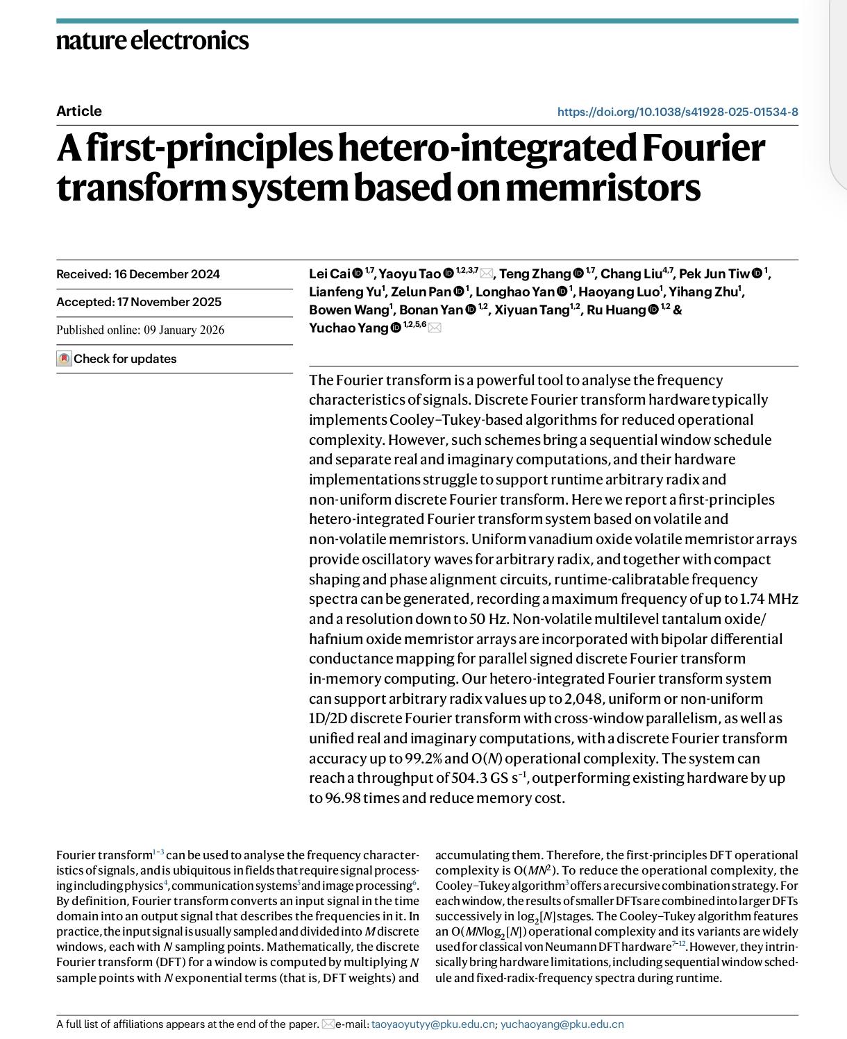 近日,北京大学科研团队在国际上首次实现后摩尔新器件异质集成的多物理域融合傅里叶变换系统,提出了突破当前傅里叶变换系统速度与功耗瓶颈的关键技术,标志着傅里叶变换硬件架构实现从算法驱动走向器件物理域驱动的重大跨越。该成果1月9日发表于国际顶级学术期刊《自然∙电子》。