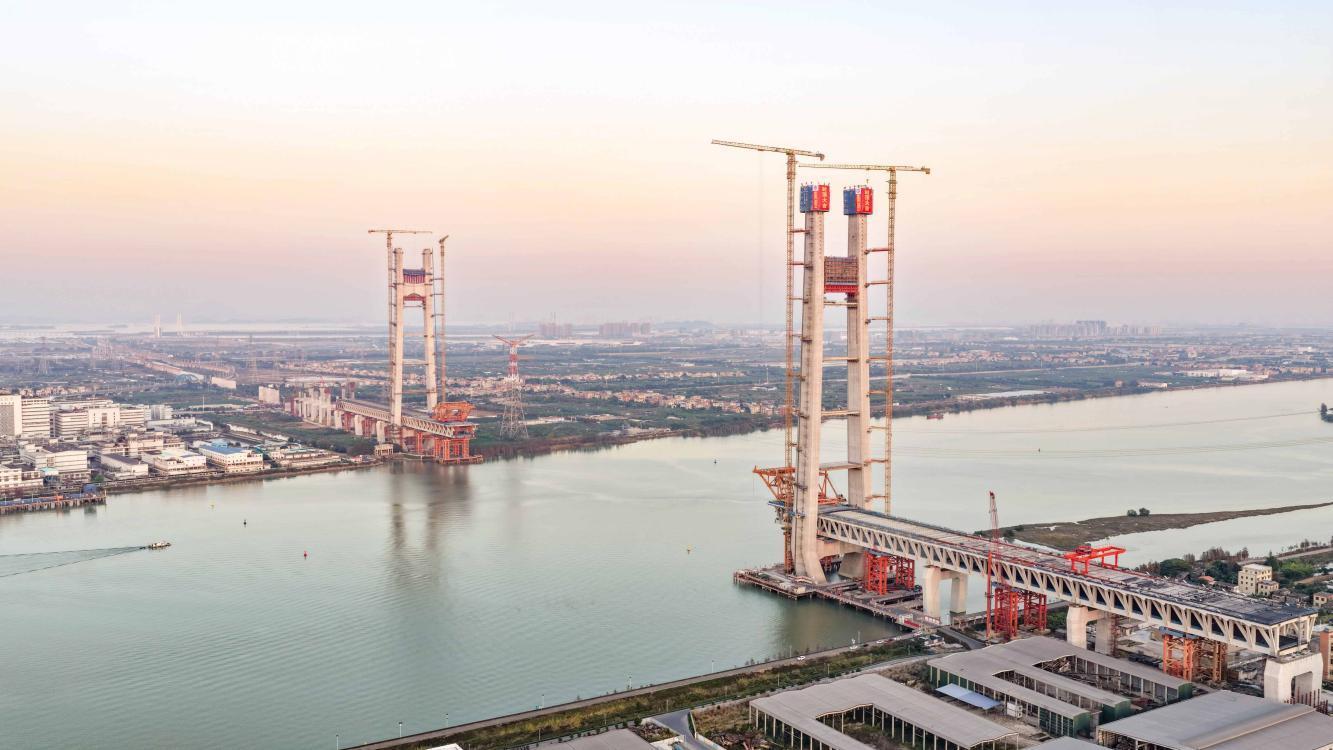1月11日上午,深江铁路洪奇沥水道公铁大桥50号墩主塔顺利封顶,塔高达到258米,相当于80余层楼房高度。至此,这座大湾区关键交通工程的两座主塔全部完成封顶,标志着深江铁路建设取得阶段性重大突破,迈入中跨主梁架设及斜拉索施工阶段。