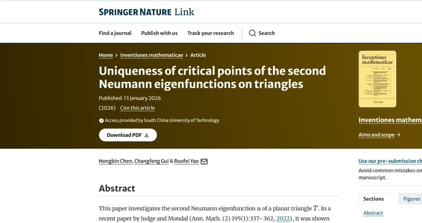 1月13日,世界顶尖数学期刊《数学新进展》在线发表了华南理工大学数学学院副教授姚若飞与西安交通大学教授陈红斌、澳门大学教授桂长峰共同合作的一项成果。该成果破解了数学界的“热点猜想”关键难题。