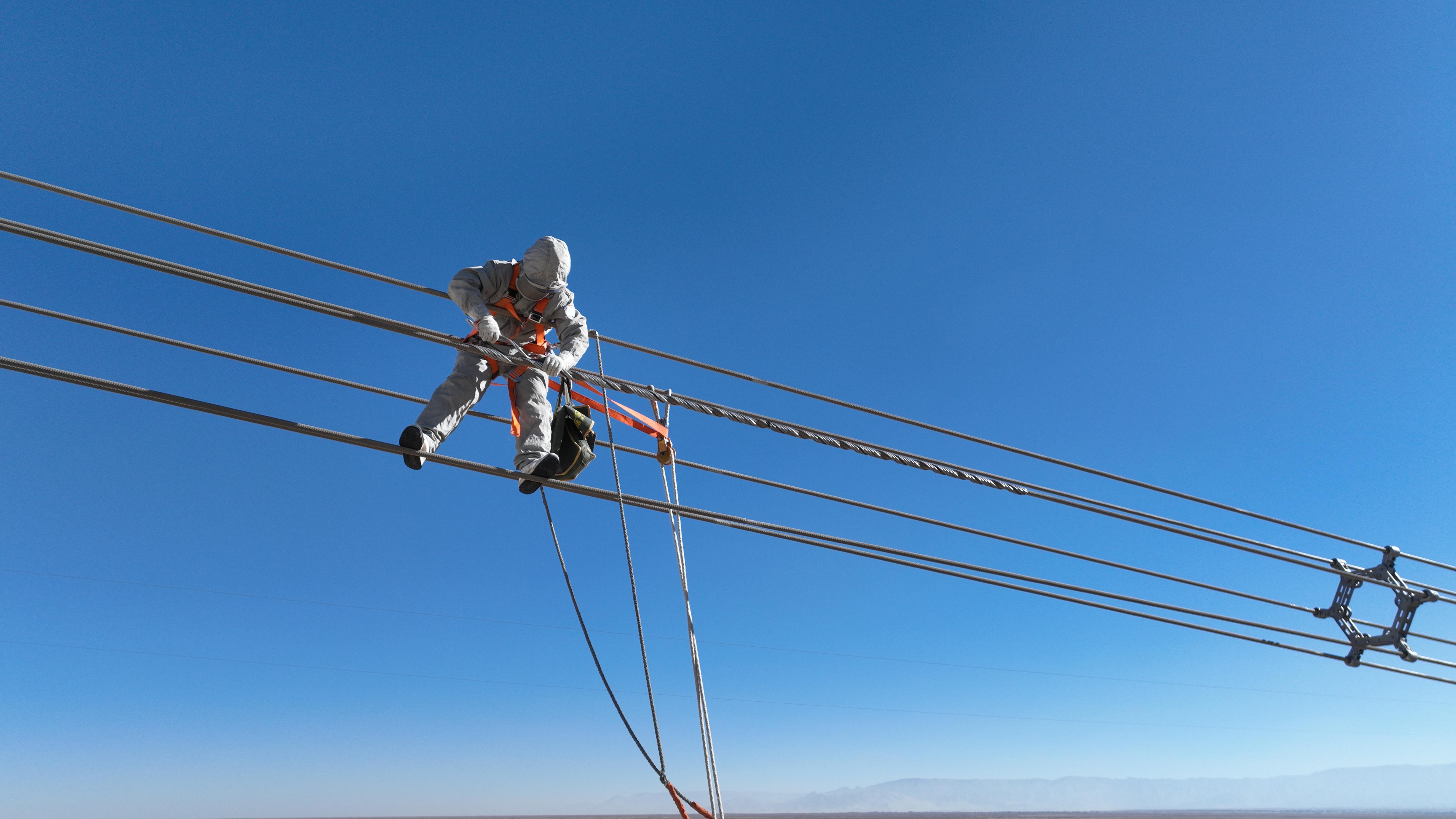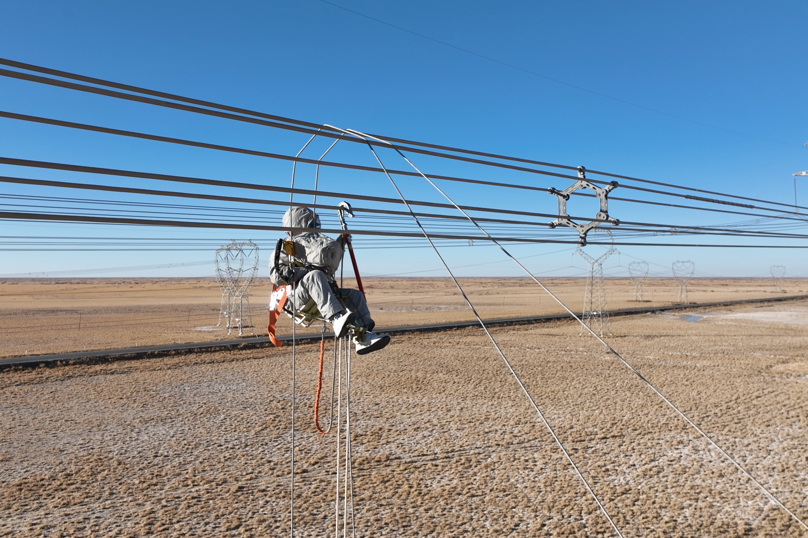 记者从国网青海超高压公司获悉,近日,在海拔2800米的青海柴达木盆地,该公司格尔木运维分部带电作业人员连续三天完成三场带电作业,为受损的导线进行一场精密的高空“绣花”,及时消除新疆与西北主网联网第二通道750千伏柴鱼Ⅱ线的危急缺陷。此次带电作业采用“无人机+电动升降机”协同作业模式,多旋翼无人机精准抛投绝缘绳,搭建空中作业通道;等电位作业人员乘坐电动升降机,如坐“电梯”般垂直上升进入强电场,无需人工攀登铁塔和软梯等登高作业,降低了高海拔严寒环境下的作业风险。