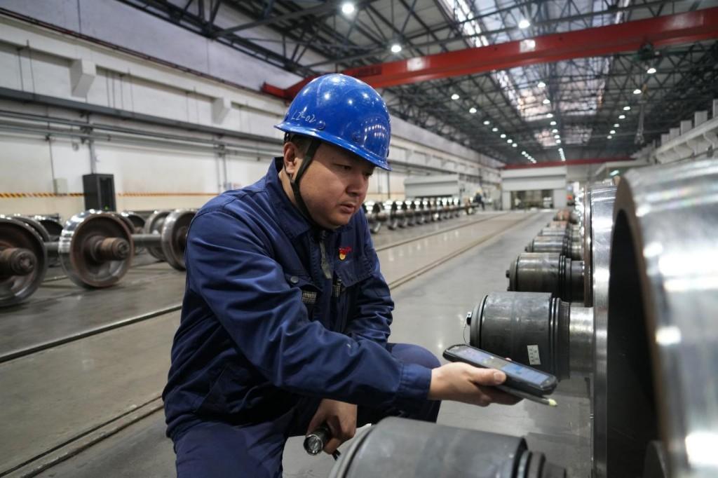 1月16日,在我国最北铁路车辆段——齐齐哈尔车辆段的齐齐哈尔修配车间,轮轴班组副工长陈世宇正在使用手持机对轮对进行效验检查。“轮轴全寿命周期智能检修系统”正式投用,标志着他们攻克了铁路货车轮轴检修的难题。