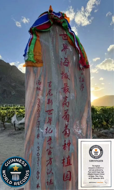 据帕竹酒庄创始人屈天文介绍,2011年,酒庄在15亩葡萄藤试验田里种下60多个品种。经过数年种植,最终只有6个品种被保留,包括后来自主培育的“超高海拔A”红心葡萄。2014年,试验田种植的葡萄首次酿酒成功,也验证了在超高海拔地区,葡萄“种植-酿酒”在技术上的可行性。帕竹酒庄以海拔3563.31米获得吉尼斯“世界海拔最高葡萄种植园”认证。