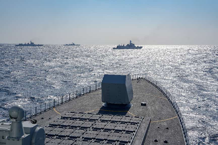 由海军大连舰、昆明舰、银川舰、海口舰等多艘主战舰艇组成的训练编队在大洋深处练协同、练指挥、练装备,检验完善方案预案,进一步提高各级指战员的快速反应能力。