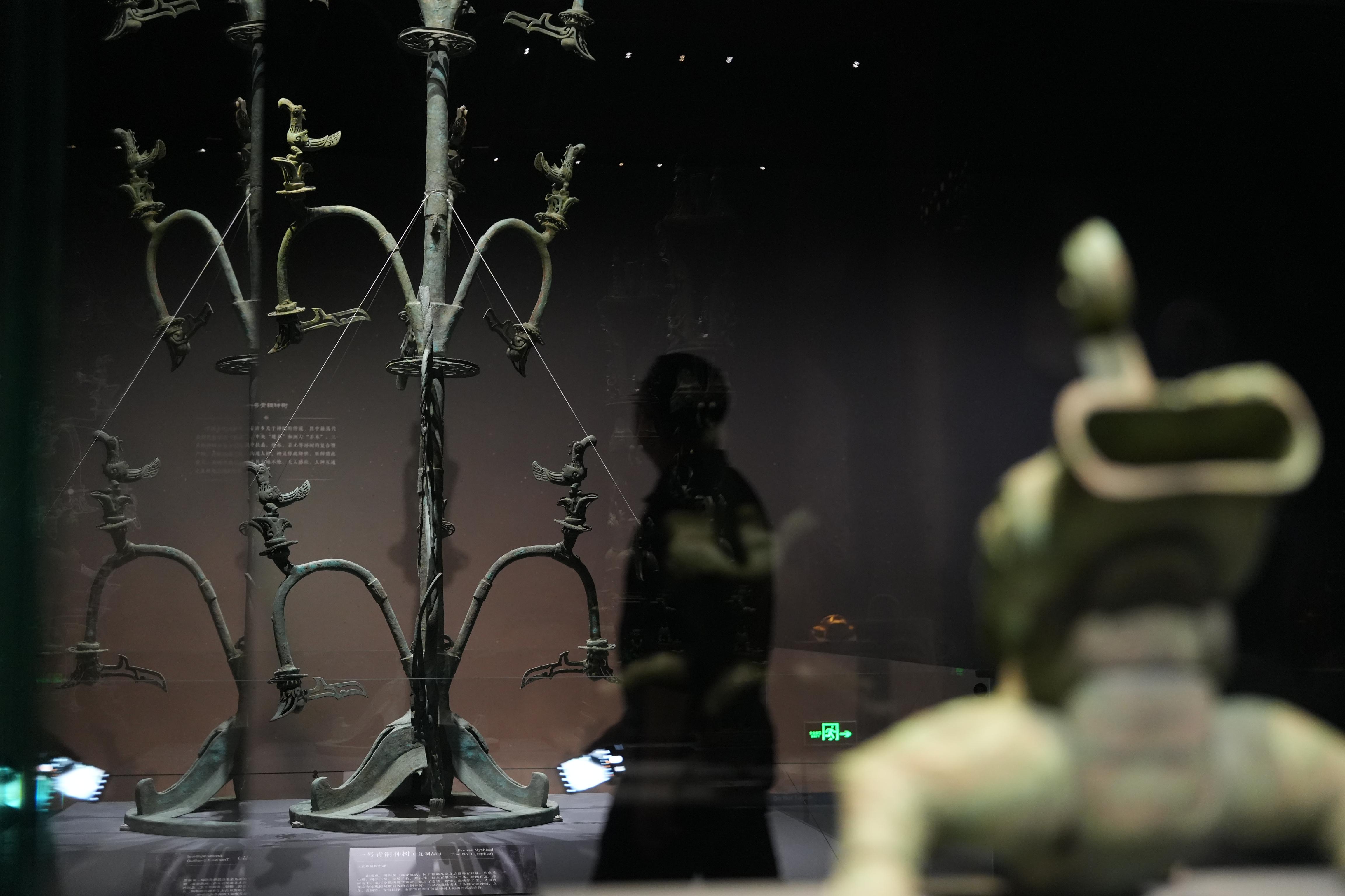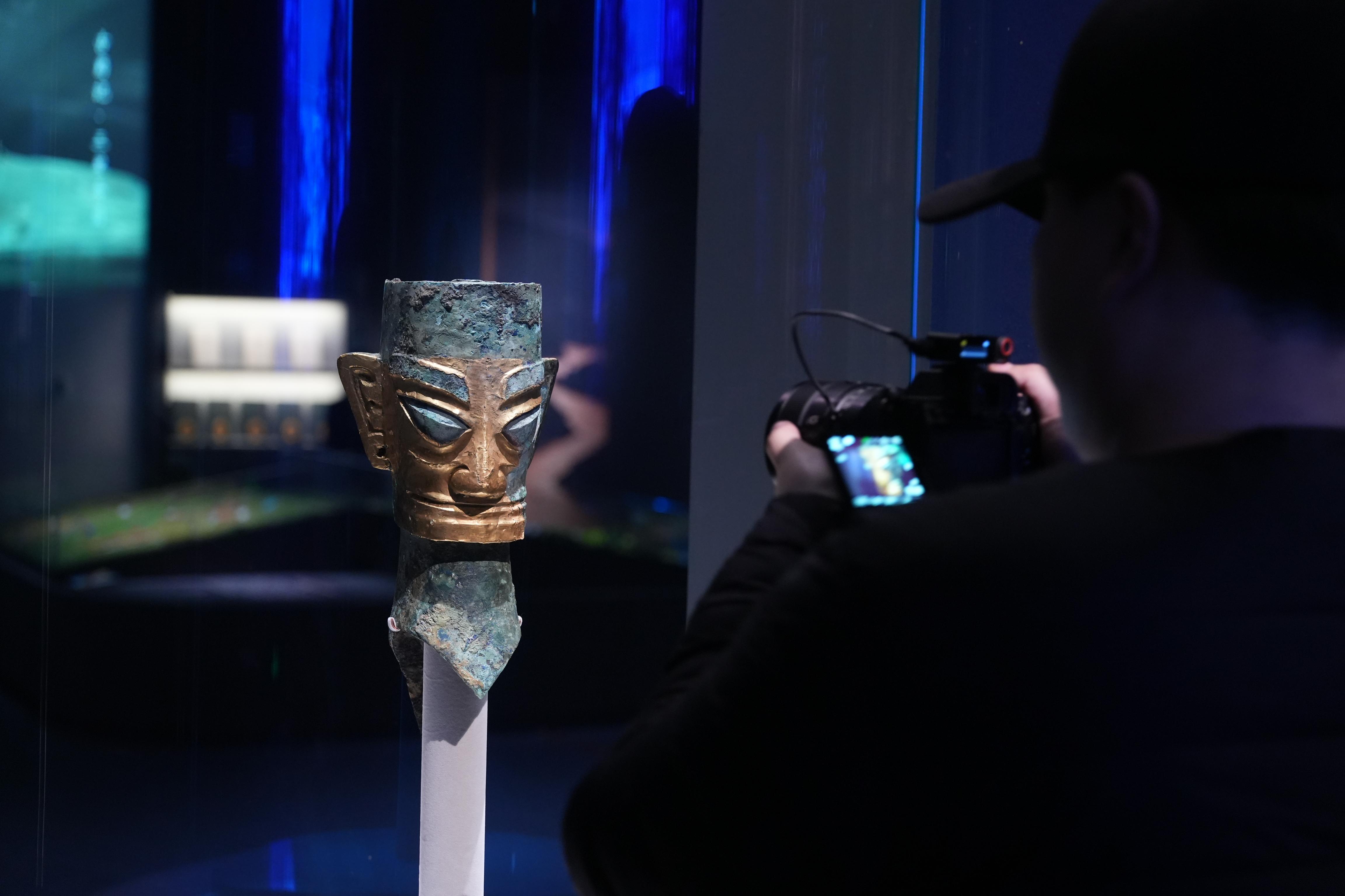 展厅内,双目如棱的戴金面罩青铜人头像,玄奇诡谲的戴冠纵目面具,以及青铜立人像、龙柱形青铜器、肩扛象牙人形纹玉璋等,讲述着古蜀先民的生活与精神世界,也反映了古蜀文明与中原地区及长江中下游地区的密切联系。