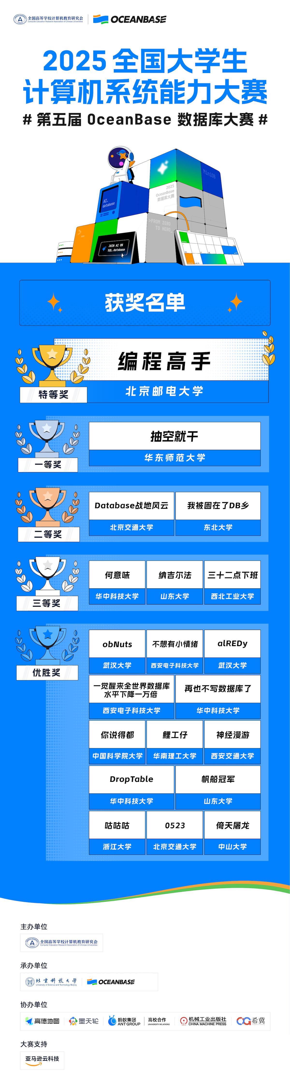 1月18日,2025年全国大学生计算机系统能力大赛暨第五届OceanBase数据库大赛在北京科技大学落幕。本届赛事吸引来自全国高校的1223支队伍、2620名学生参赛。经过两个多月比拼,北邮“编程高手”队凭借在数据库内核优化与AI应用开发中的综合表现,获得冠军及10万元奖金。