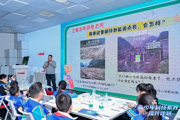 这些源于家乡真实场景的提问,配合着同学们用心制作的场景展示板,让这些带着地域特色与生活温度的问题,既生动又形象。隆基绿能可持续发展专家汪子阜现场对同学们的问题给与回答:光伏+水电的互补方案,为老旧水电站注入新活力;光伏大棚、屋顶光伏系统,精准回应了乡村与城市的绿色需求……同学们将写有“让大棚用上太阳能”“家乡山坡布满光伏板”“让学校拥有光伏雨棚”等绿色心愿的叶片贴纸,共同贴在“绿色能源之树”背景板上,以童心共绘未来绿色图景。