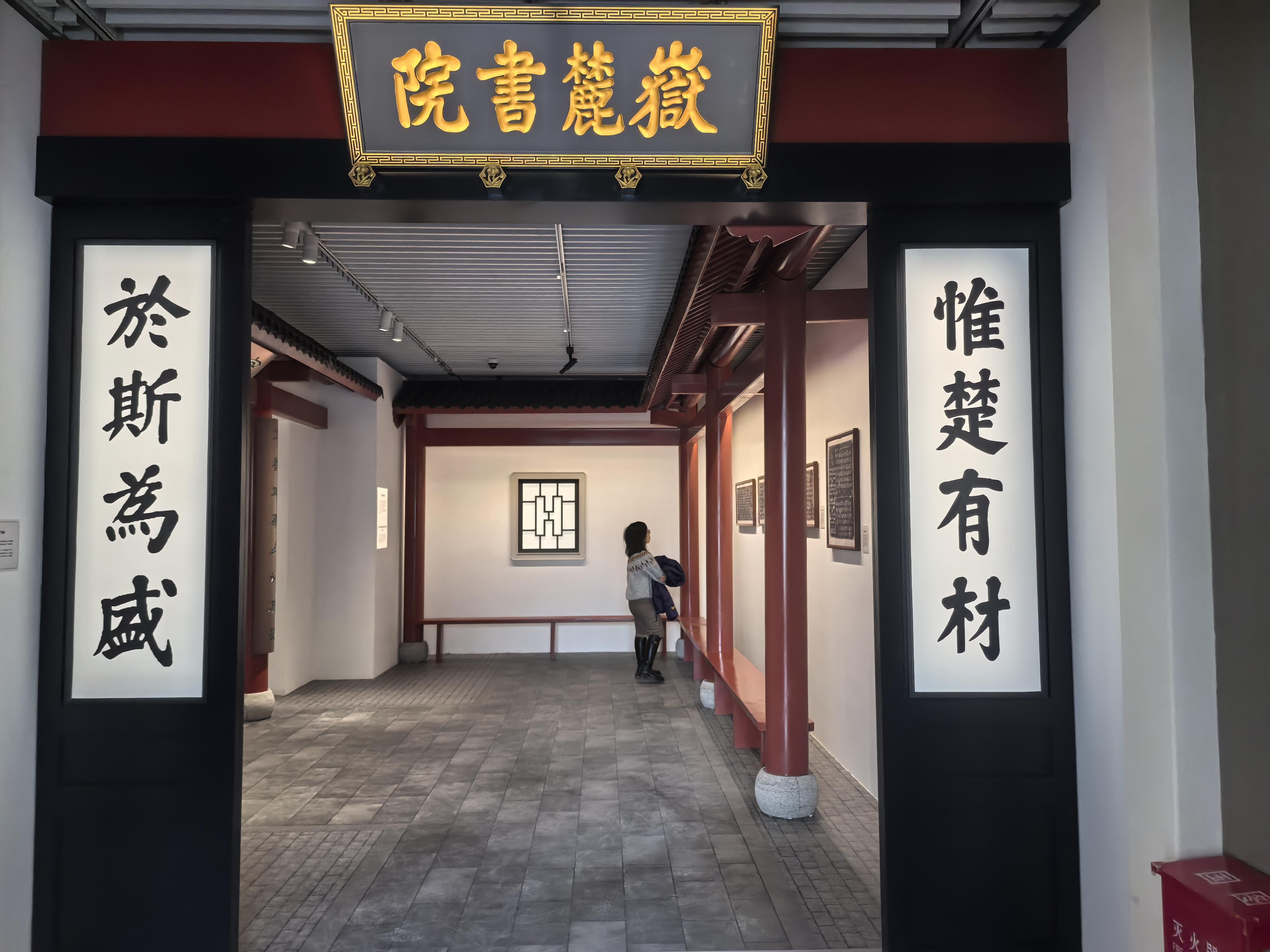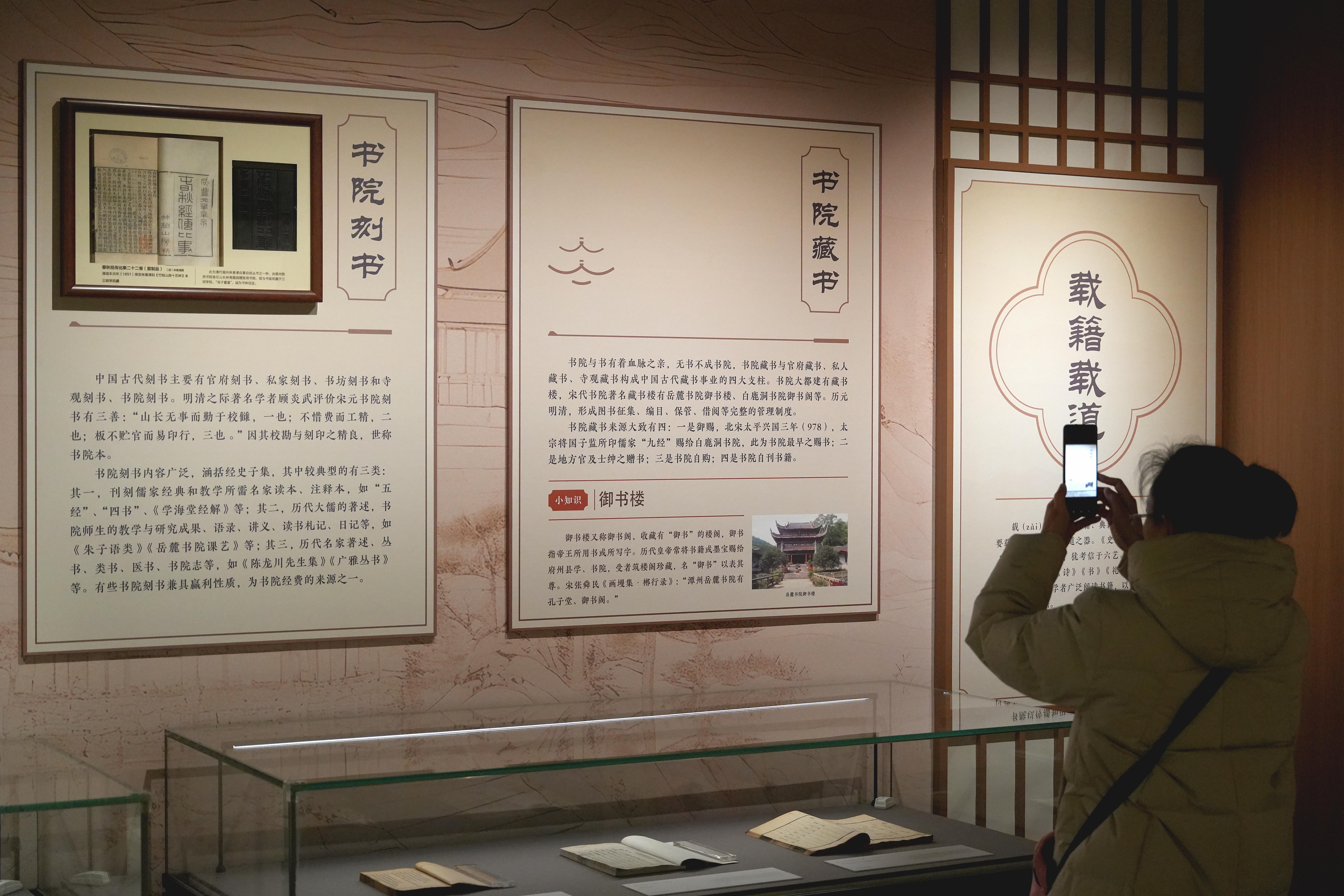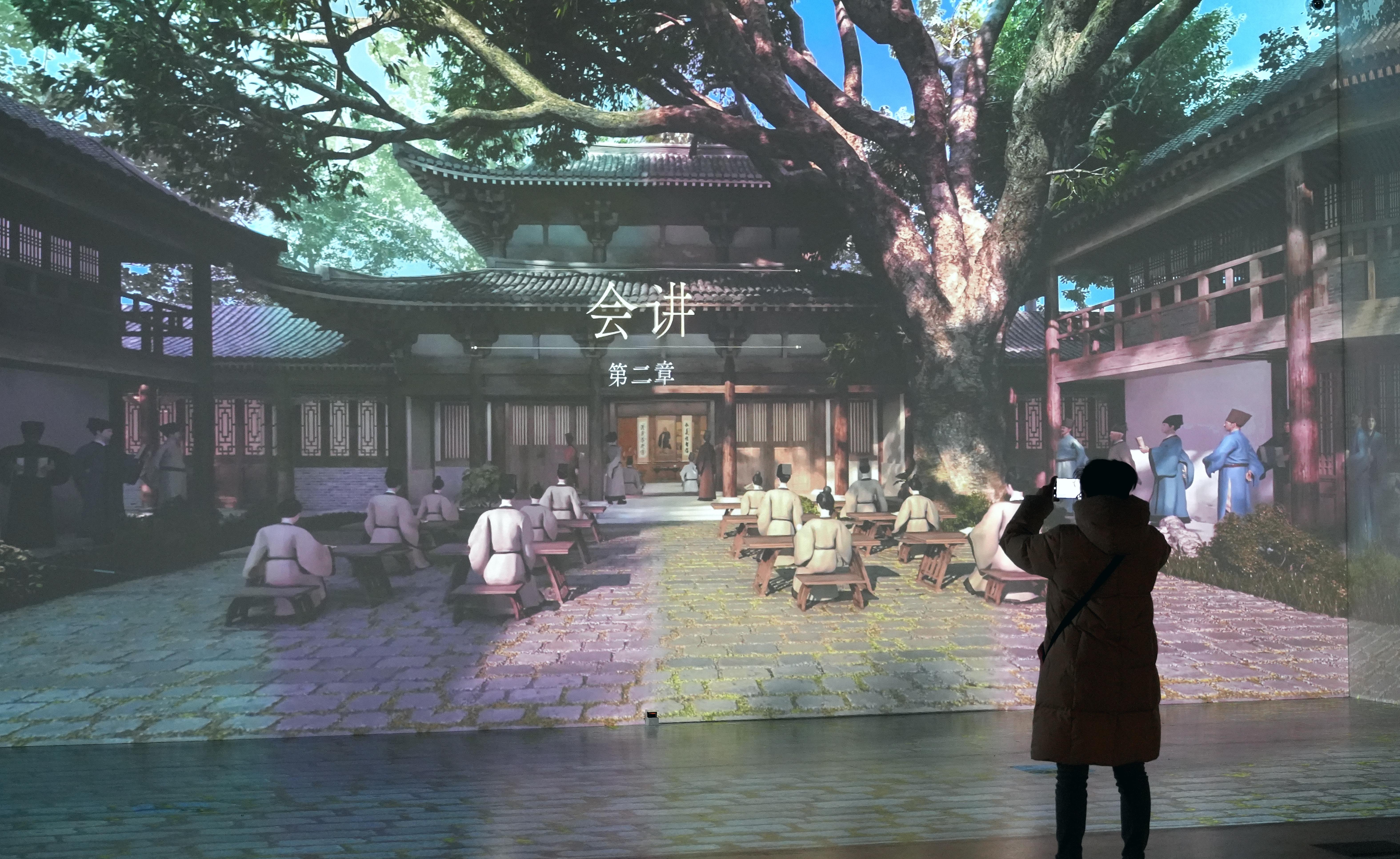 展览还设置有多媒体展项:“书院传道”利用LED屏展示杏坛讲学、庐山白鹿洞书院缘起、嵩阳书院二程讲学、鹅湖之会等代表性的场景,通过光影与空间叙事,直观呈现古代书院精神以及思想碰撞,打造沉浸式的文化对话体验;“书院四季”运用投影打造裸眼3D的沉浸式空间,通过晨读、会讲、祭祀、藏书刻书四大场景,再现古代书院的鲜活图景,用沉浸式空间展现书院千年的文脉传承;展览中还设置了“书院漫游”实景VR体验区,参观者通过VR眼镜,沉浸式游览岳麓书院,身临其境体验实事求是精神的古今传承。此外,观众还可以通过“数字甲骨”“书院之‘书’”等展项,开启一场多重感官的沉浸之旅,感受书院跨越时空的文化魅力与精神脉搏。