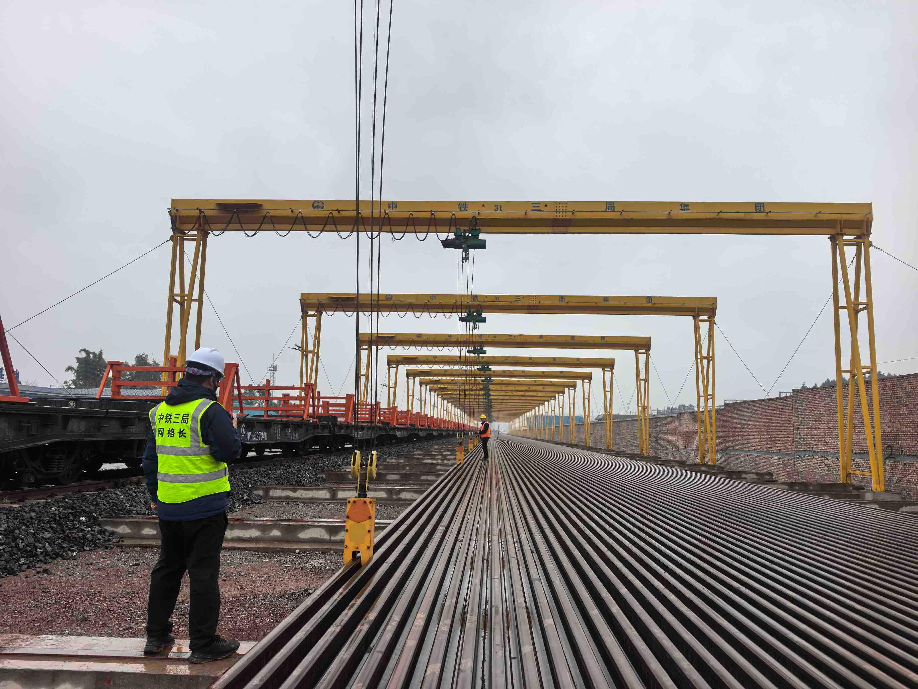 “500米长轨相比传统短轨,能大幅减少线路接头,提升列车运行平稳性和安全性,但对运输、装卸和后续铺设都提出了极高要求。”中铁三局成达万高铁铺架分部负责人王志军介绍。南充北铺轨基地占地约5.2万平方米,此次首批到达的500米长轨共计50根,重量达1500吨,可铺设12.5公里线路。钢轨来自数百公里外的石板滩焊轨基地,在完成焊接装车后,经由成都北站、遂宁站、南充西站,到达南充北站后转入铺轨基地。