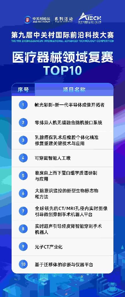 1月20日,2026中关村论坛系列活动——第九届中关村国际前沿科技大赛医疗器械领域复赛在中关村医疗器械园举办。经过专家评审,10项具备核心创新力的项目脱颖而出,入围该领域TOP10名单。