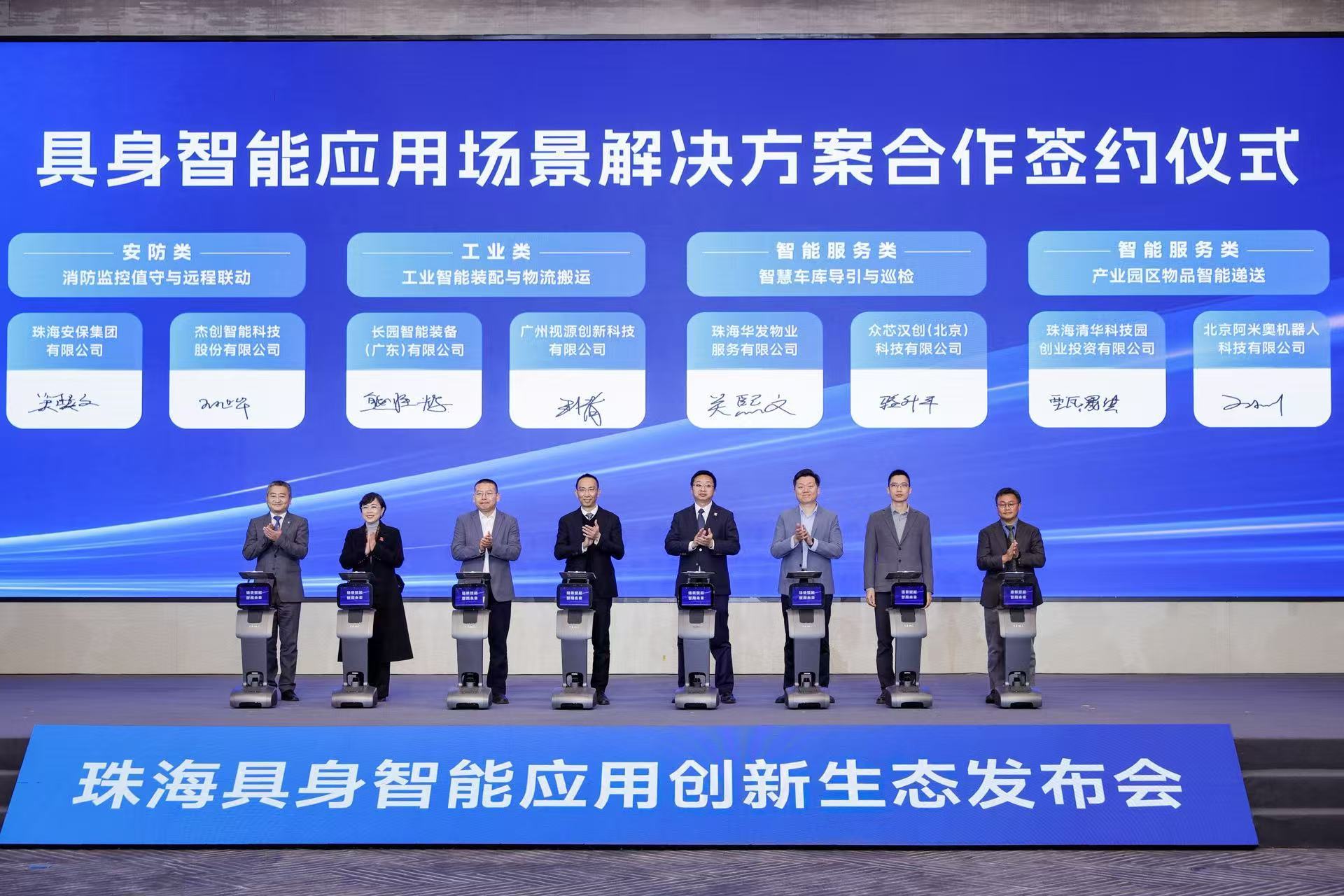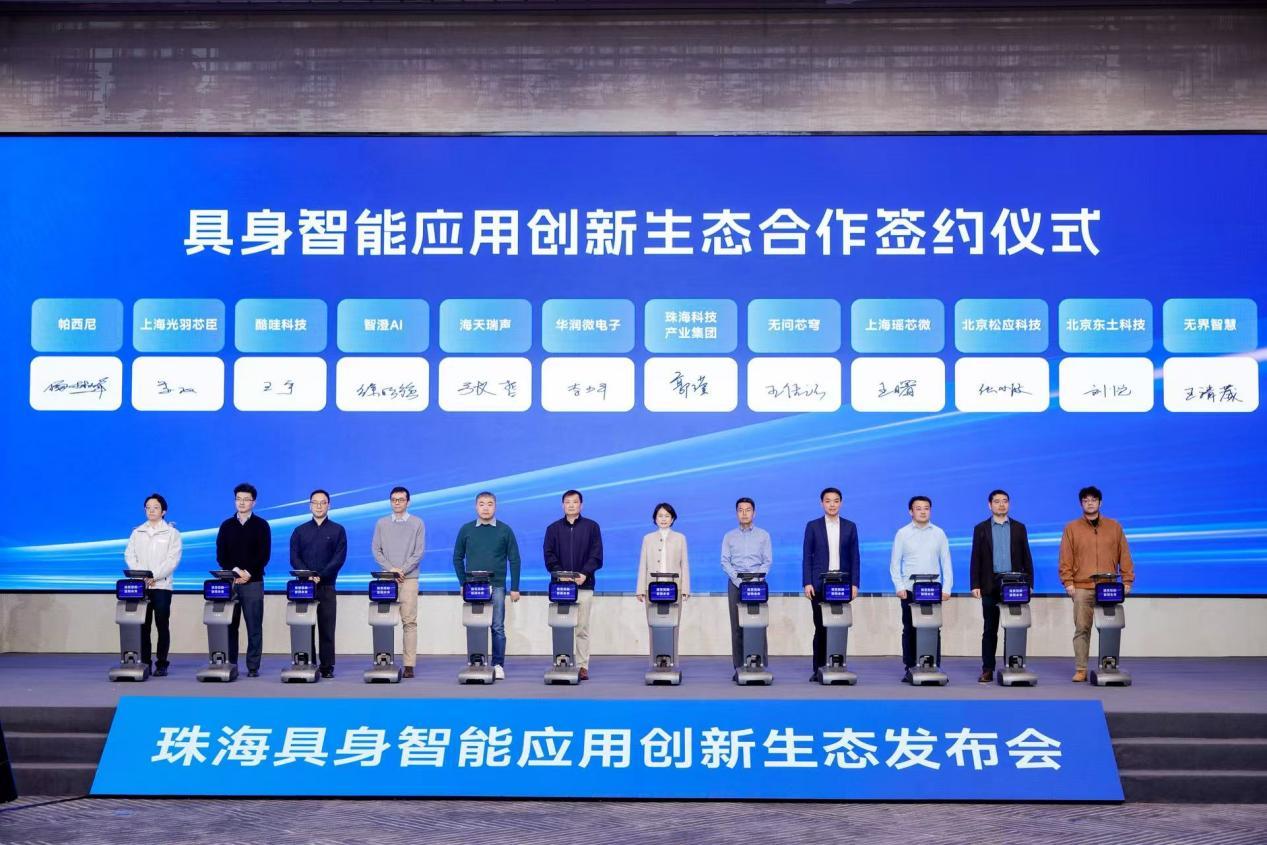 发布会现场,珠海水控集团、华发物业、北理工附属实验学校等需求方与杰创智能等供应商签约;华润微电子、傲意科技、无问芯穹、智谱、酷哇科技、千寻智能、智澄AI、乘杜科技、帕西尼等20余家产业链头部企业与珠海科技产业集团就共同建设珠海具身智能应用创新生态进行签约;珠海科技产业集团与智元创新(上海)科技股份有限公司联合发起设立具身智能创新生态基金。