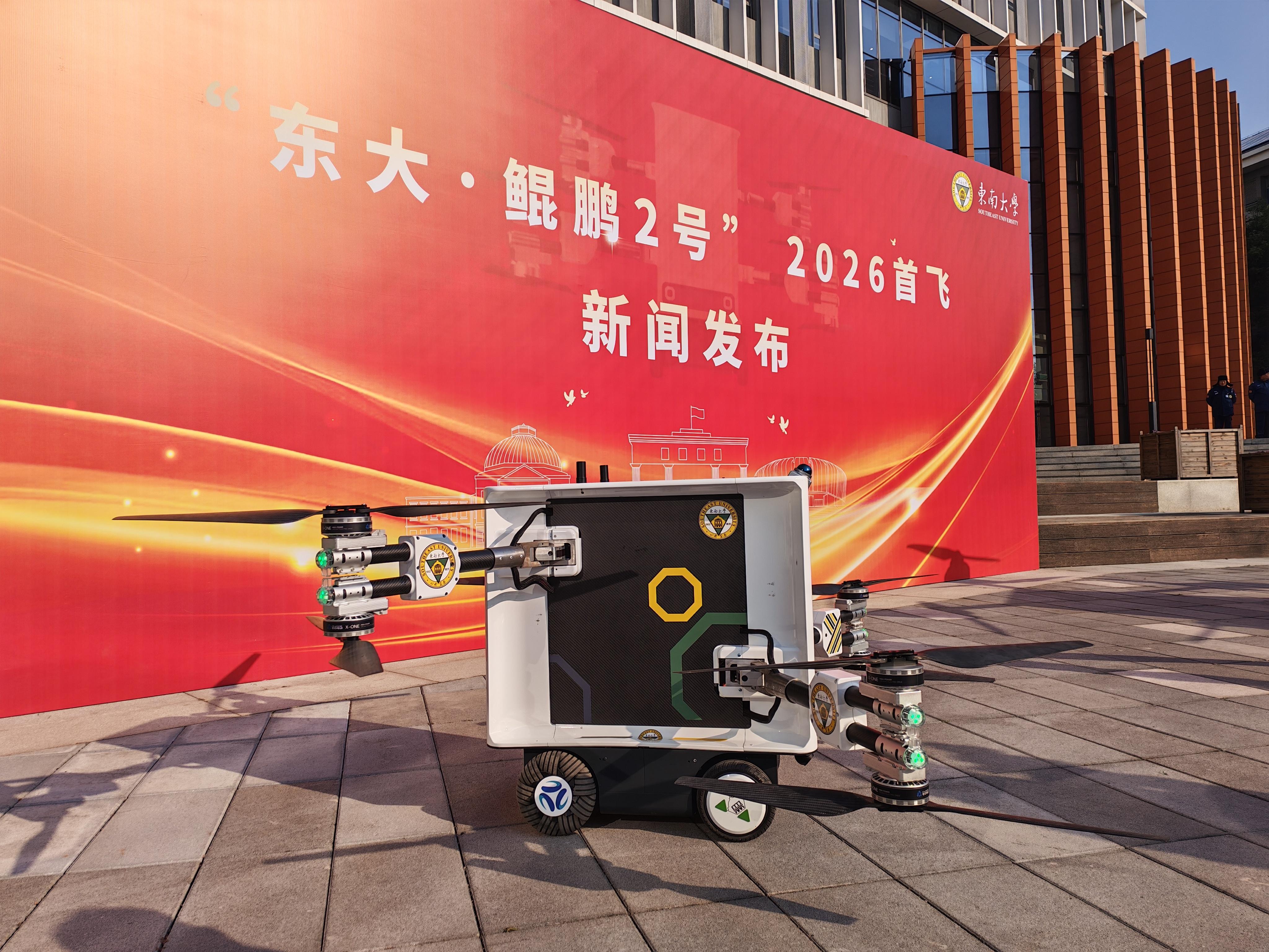 “‘东大·鲲鹏2号’在继承一代平台空地一体核心理念的基础上,针对规模化商用场景重新定义。”殷国栋介绍,该平台以“轻松载物、便利行驶”为设计出发点,创新性地采用了可折叠机臂结构,解决了停放与行驶的痛点,并凭借冗余安全的飞行构型、强大的负载能力、创新的陆地底盘及高精度导航系统,构建了一个高效、可靠、空地无缝衔接的专业作业平台,为低空经济在物流、巡检、应急等领域的务实发展提供了有力工具。