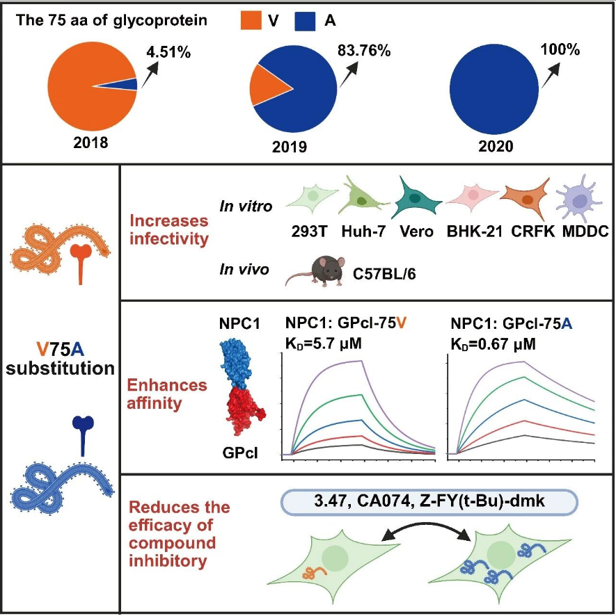 研究团队首先对480条EBOV全基因组进行分析,发现携带糖蛋白GP-V75A突变的毒株在疫情早期出现,之后迅速取代原始毒株,其流行趋势与病例激增高度重合,提示该突变可能提高了病毒的传播优势。